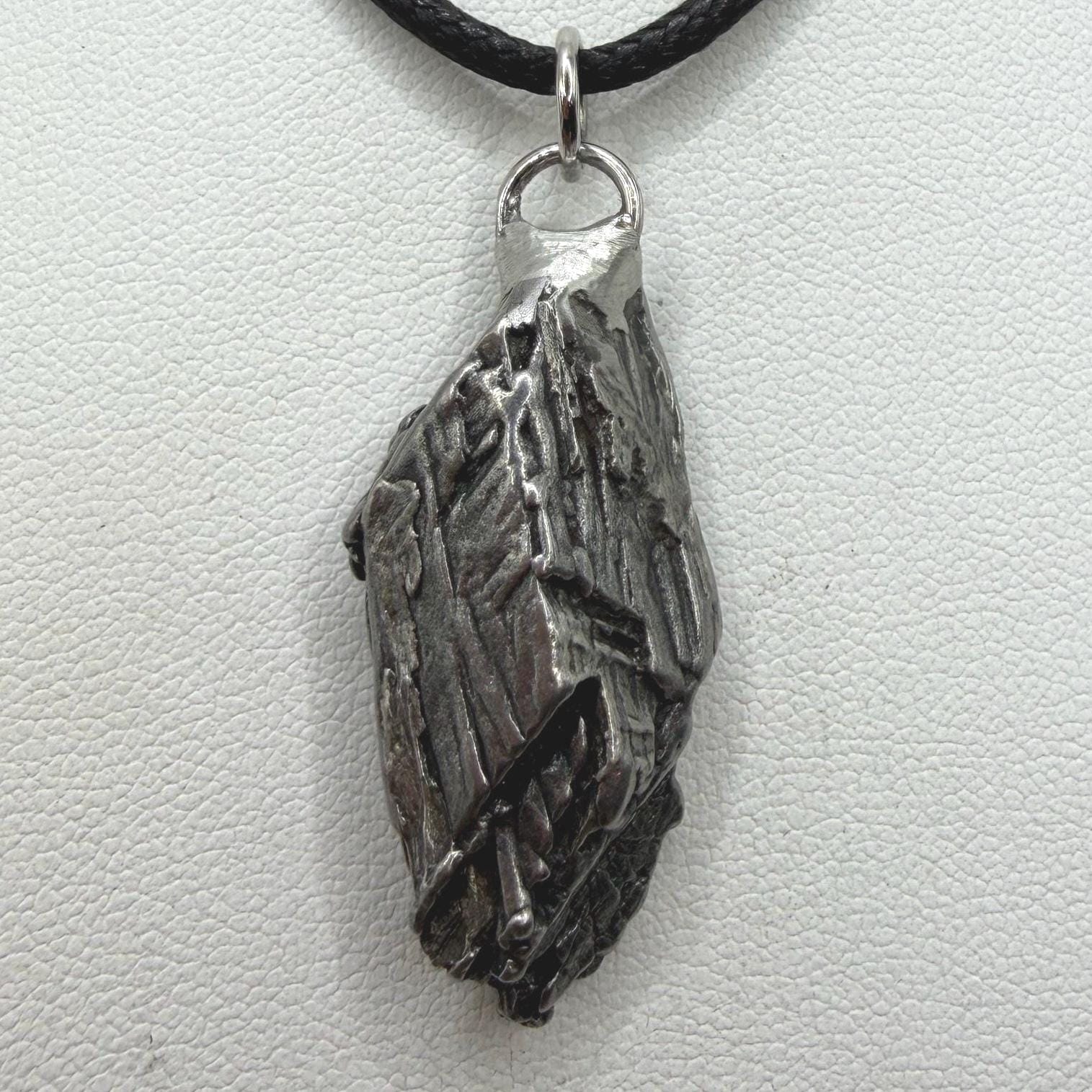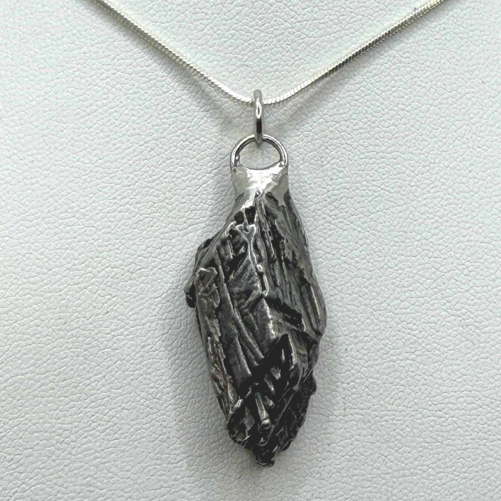 A gleaming silver plated ring forms the perfect juxtaposition, adding a modern twist to this exquisite piece. The shimmering silver complements the meteorite's natural patterns and textures, further enhancing its remarkable beauty. This pendant effortlessly combines both strength and grace, making it a true statement accessory that is sure to turn heads.