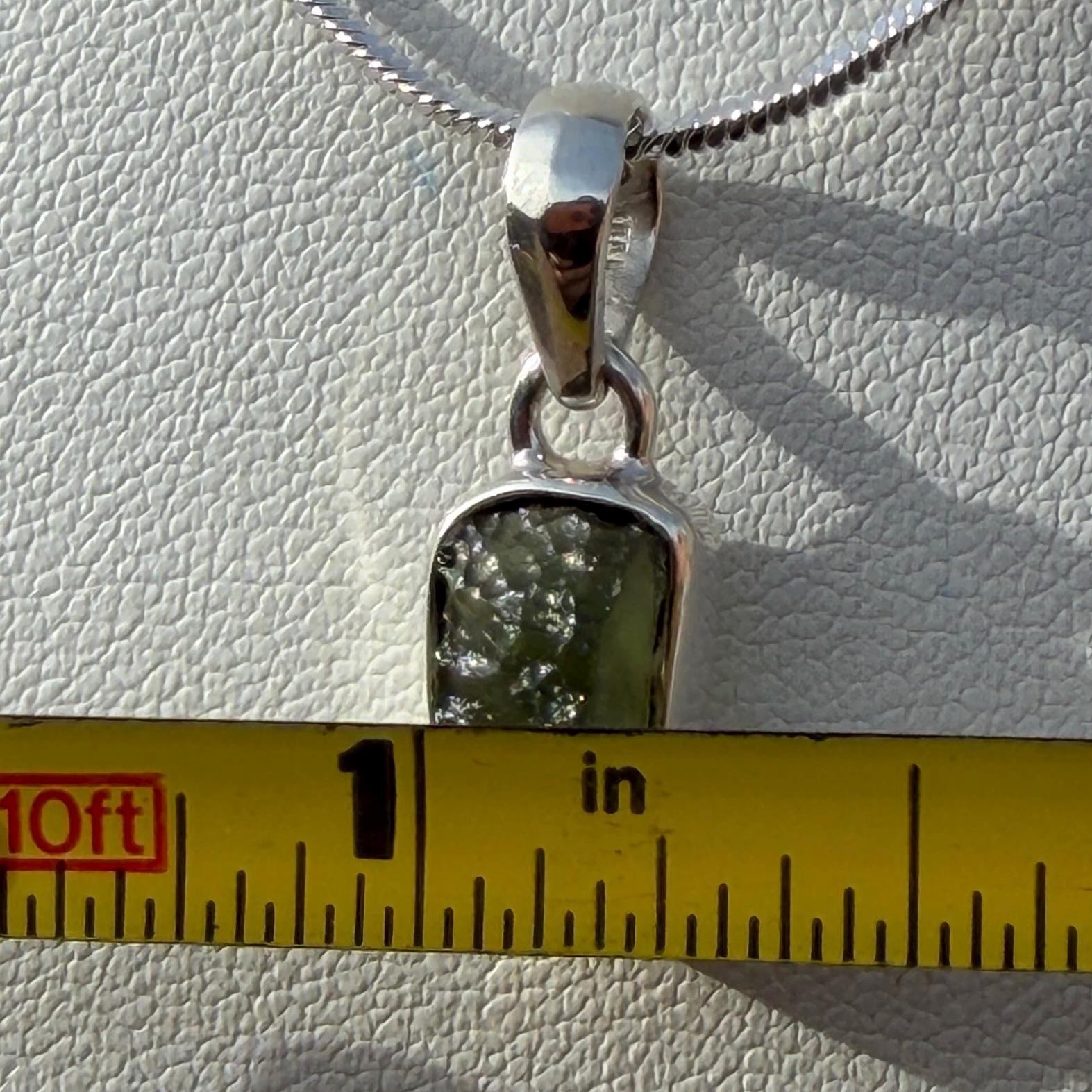 This is a stunning high-quality Moldavite Tektite pendant with a unique and eye-catching shape. This beautiful Moldavite tektite is set in a sterling silver bail. The weight of pendant is 1.52g. The pendant measures approximately 0.30” wide and 0.75” long and comes with a silver snake chain and a velvet carrying bag, making it a perfect gift or addition to any collection.