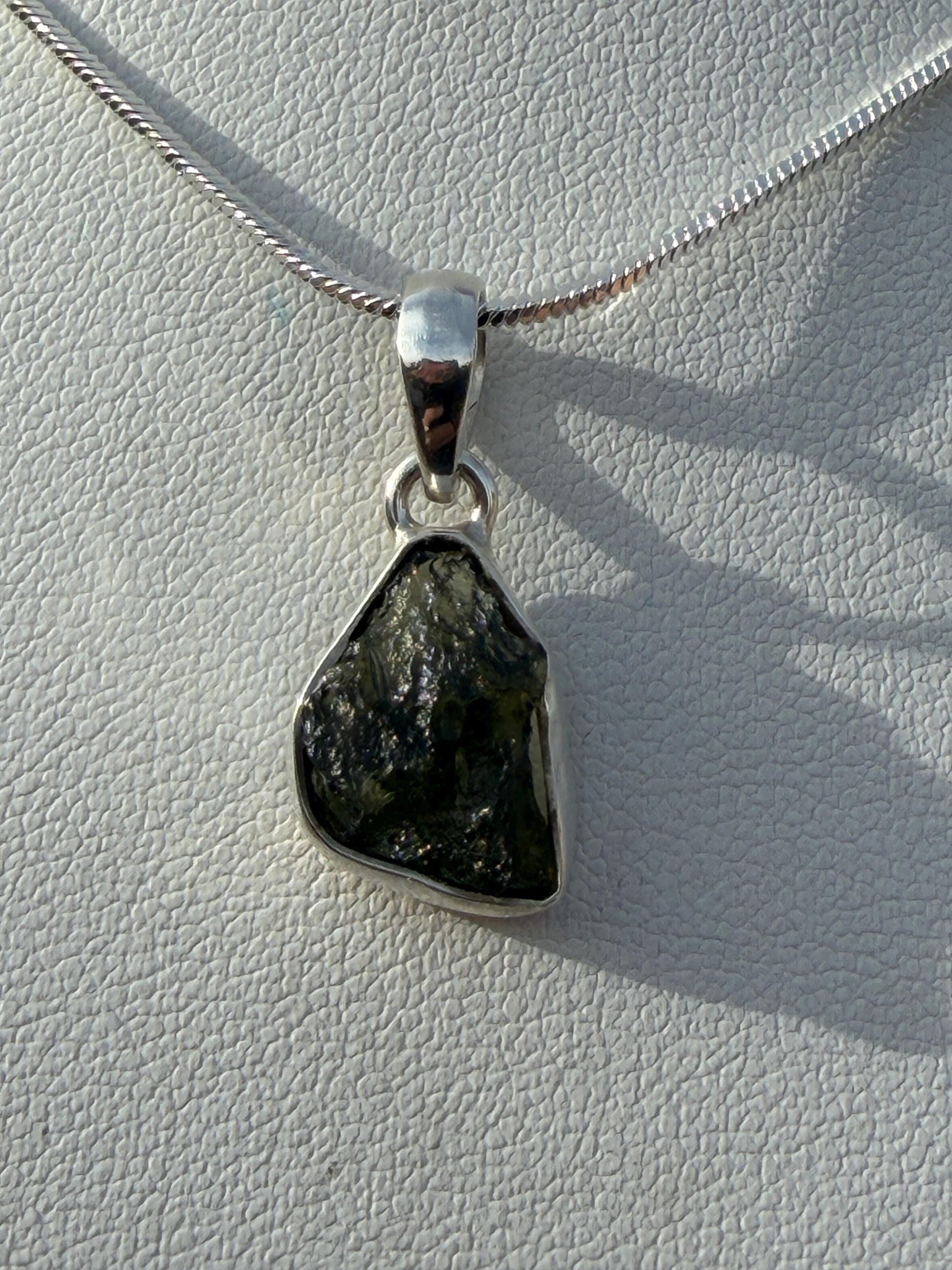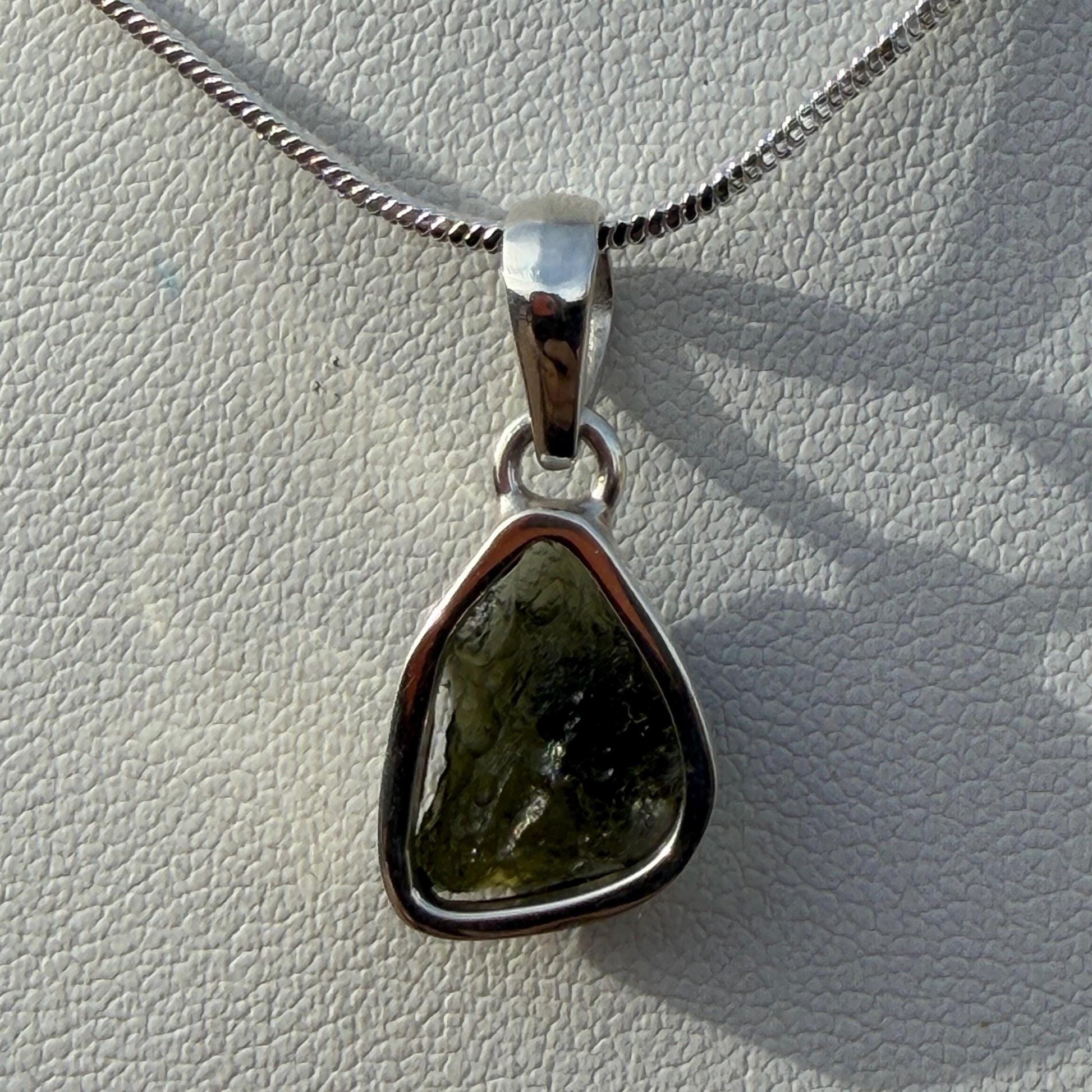 This is a stunning high-quality Moldavite Tektite pendant with a unique and eye-catching shape. This beautiful Moldavite tektite is set in a sterling silver bail. The weight of pendant is 1.83g. The pendant measures approximately 0.40” wide and 0.75” long and comes with a silver snake chain and a velvet carrying bag, making it a perfect gift or addition to any collection.