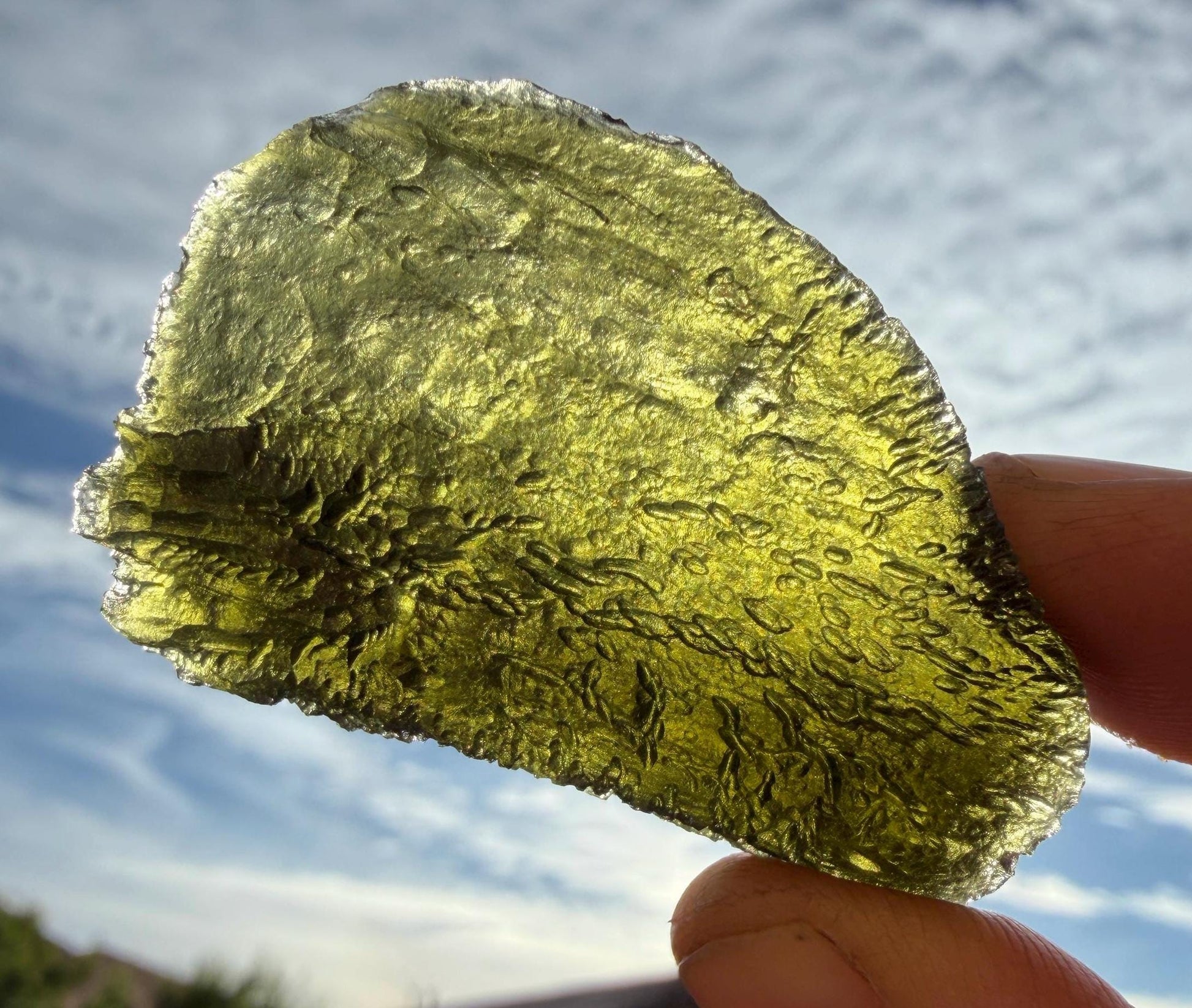 Moldavite is a member of the tektite group, a glassy mixture of aluminum oxide, silicon dioxide and other metal oxides. It’s has a hardness of about 6. The color of most Moldavite is deep forest green, though some are a paler green than others. Moldavite was formed when a large meteor crashed down in what is now the Bohemian plateau of the Czech Republic, around 14.8 million years ago.