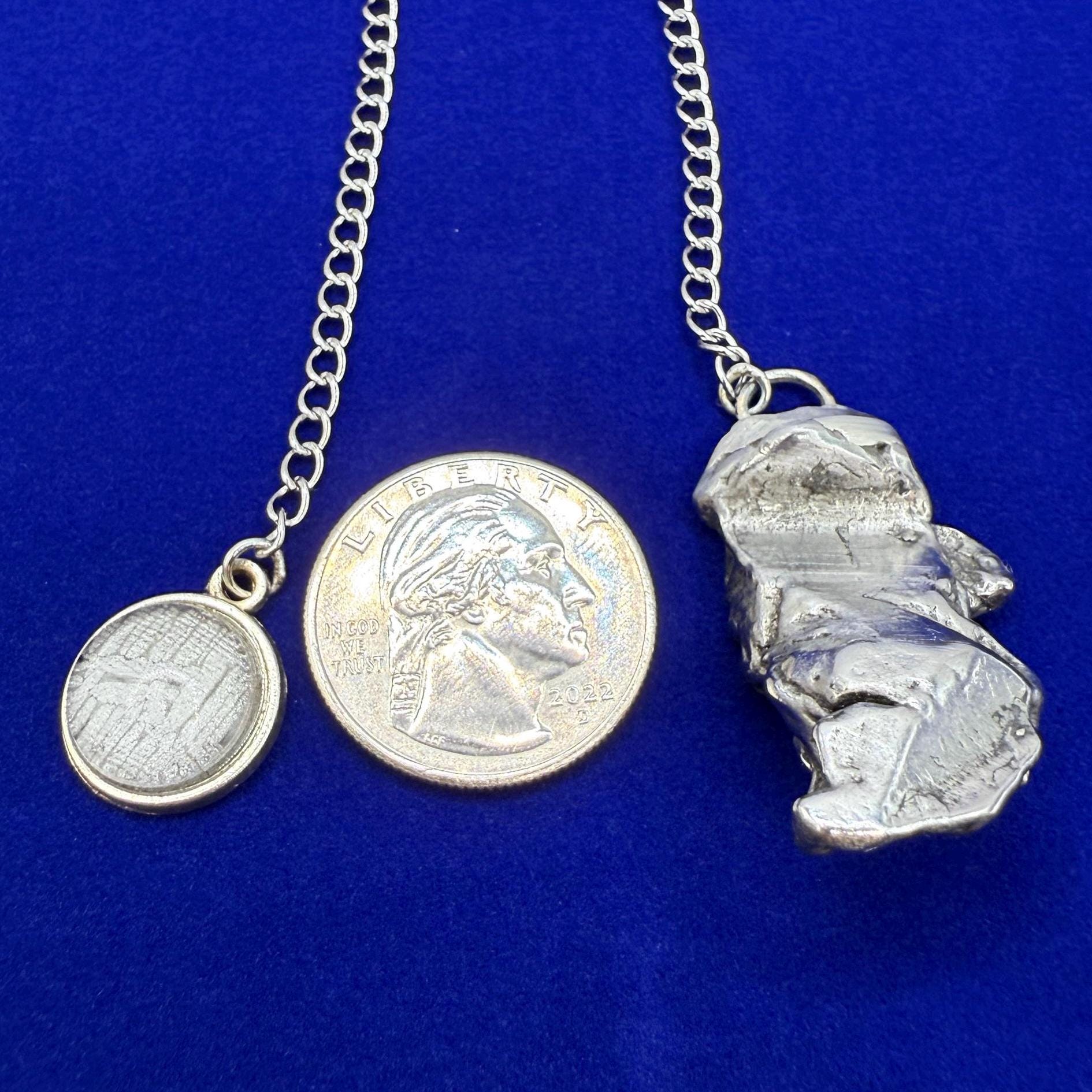Each pendulum features authentic Aletai meteorite, known for its striking Widmanstätten patterns and high nickel-iron content. Measuring approximately 10 inches in length from meteorite tip to polished circular grip, this pendulum is carefully balanced for precision and ease of use. The grip includes a small, polished Aletai fragment for a secure and comfortable hold. Weighing about 24.75 grams, it offers excellent stability and sensitivity during dowsing, chakra balancing, and intuitive readings.