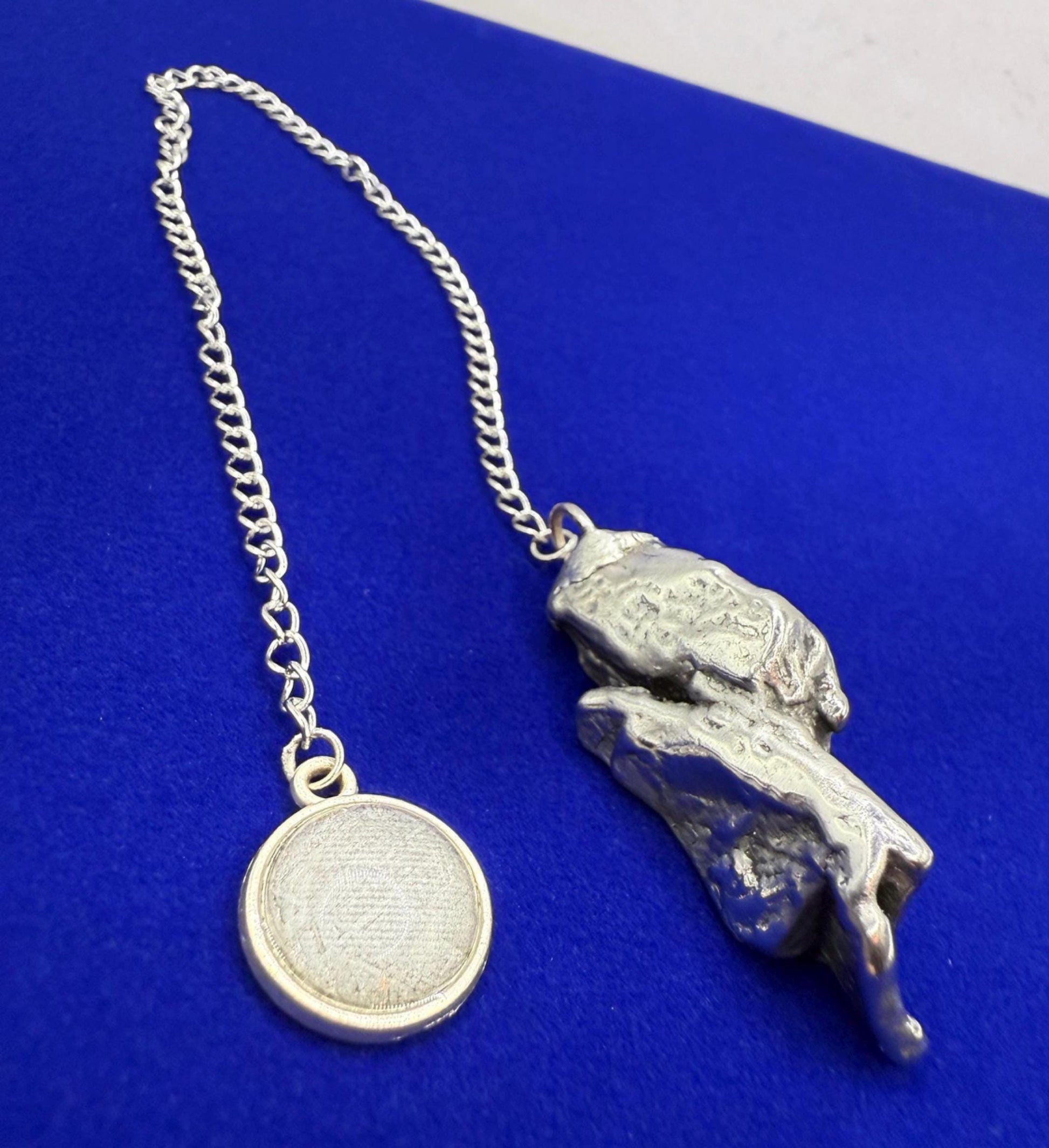 Each pendulum features authentic Aletai meteorite, known for its striking Widmanstätten patterns and high nickel-iron content. Measuring approximately 10 inches in length from meteorite tip to polished circular grip, this pendulum is carefully balanced for precision and ease of use. The grip includes a small, polished Aletai fragment for a secure and comfortable hold. Weighing about 30.29 grams, it offers excellent stability and sensitivity during dowsing, chakra balancing, and intuitive readings.