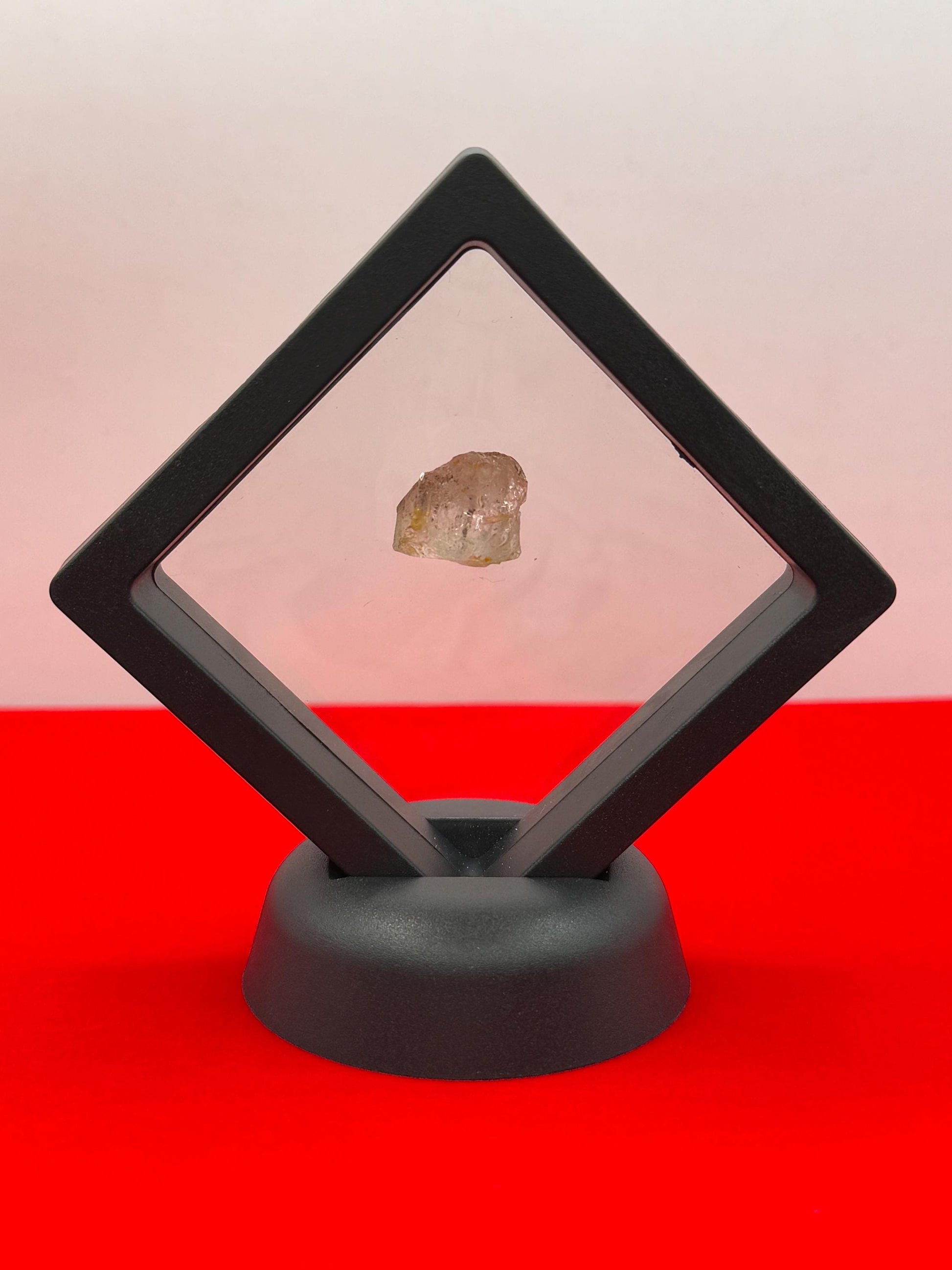 This is a beautiful high vibrational Phenacite/Phenakite crystal, from Brazil. This beautiful Brazilian Phenacite has a rare golden colored specks. The measurements of this crystal is just over 0.50” wide and 1.0” long. The weight is 2.92 grams or 14.6 carats. Comes with a floating crystal display case and a velvet carrying bag.