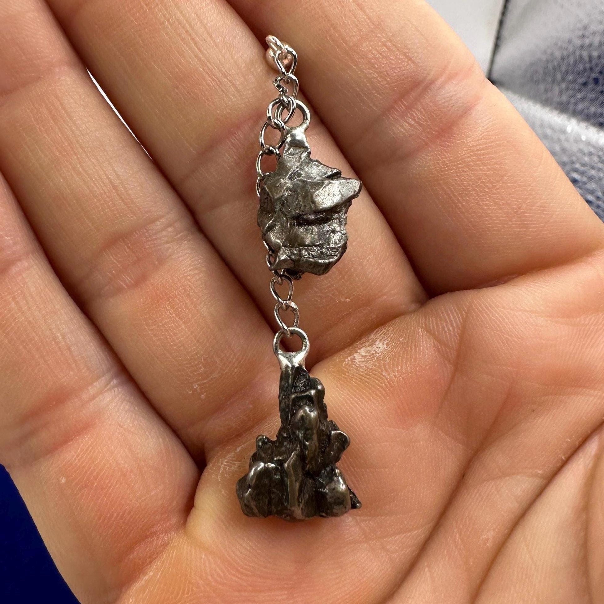 Metaphysically, Campo del Cielo meteorites are believed to carry powerful energies that connect the wearer to the universe. They are thought to enhance spiritual growth, provide protection, and foster a deeper understanding of one's place in the cosmos. Wearing these earrings can help align your energies with the vast expanse of the universe, offering a sense of grounding while opening your mind to infinite possibilities. Embrace the extraordinary with these Handmade Campo del Cielo Meteorite Dangle Earrings and carry a piece of the stars with you wherever you go.