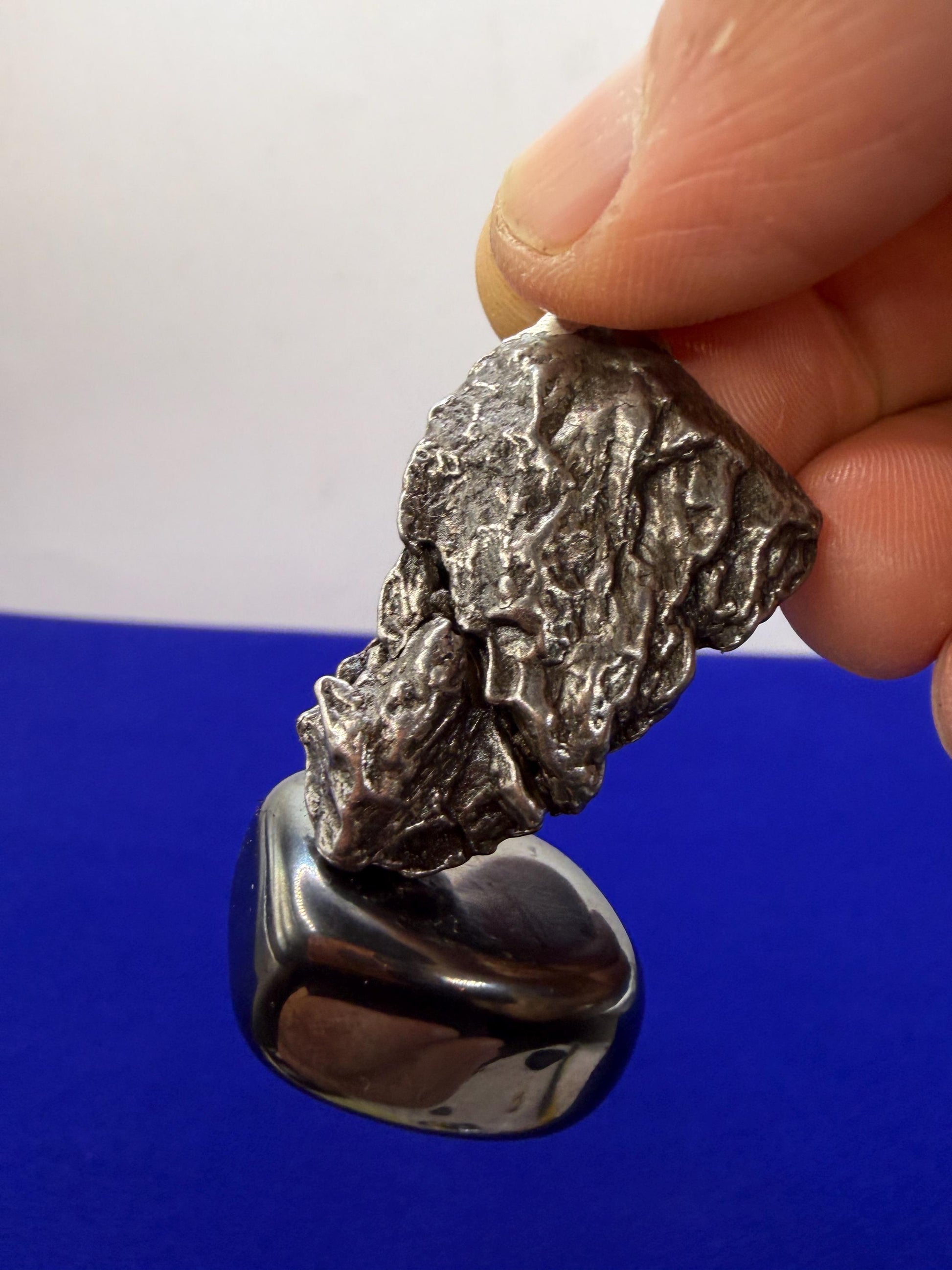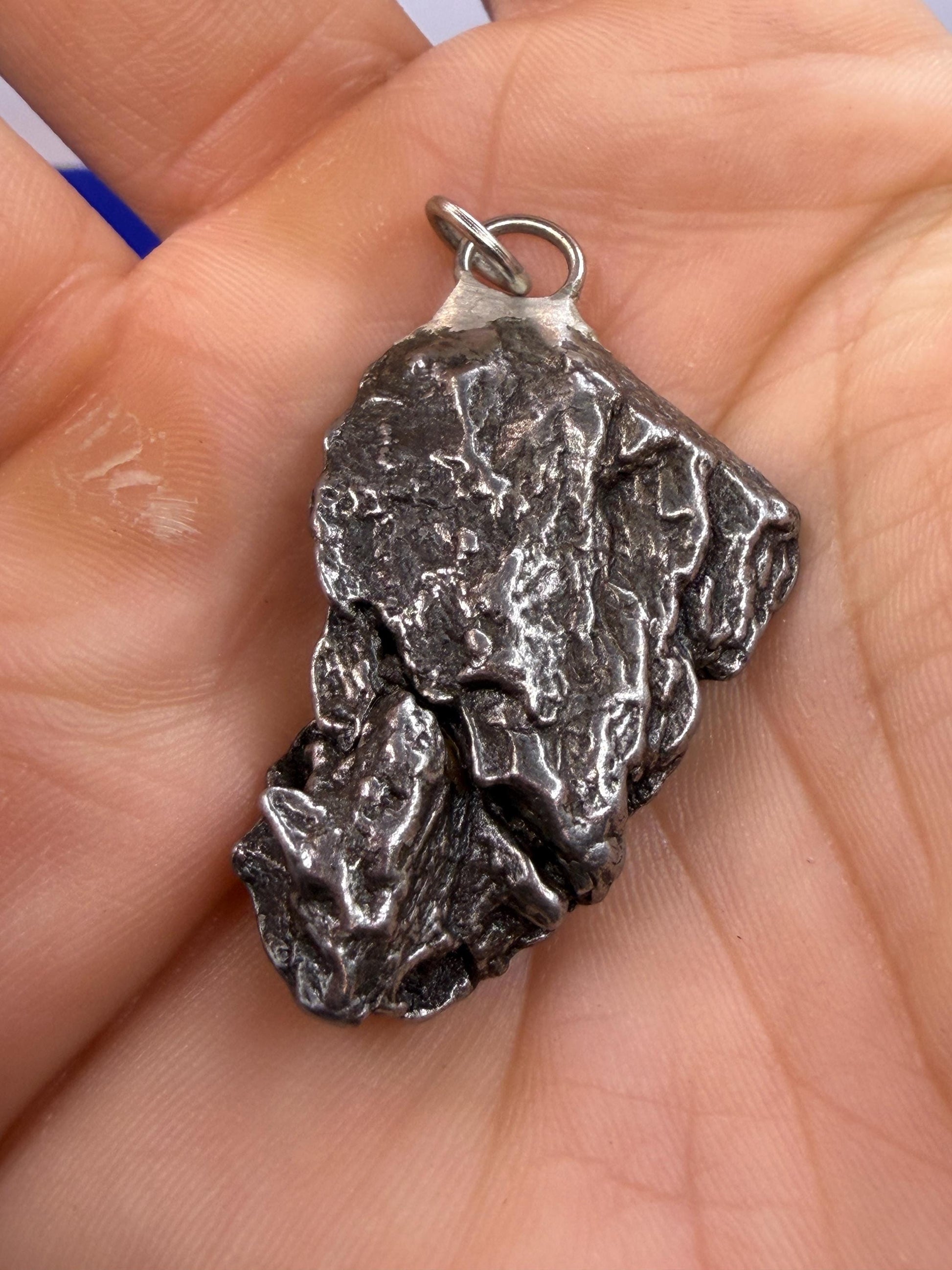 Gorgeous Meteorite Campo Del Cielo Pendant. This one has such a unique shape. The weight is 18.80 grams the meteorite is 1.0” long and 1.0” wide. It comes with a complimentary 20” sterling silver snake chain and a 20” leather necklace. It also comes with a certificate of authenticity. The perfect unique gift for those interested in Science-Fi and Space. This meteorite is gorgeous, fully regmaglypted, with no rust! Looks amazing in the sunlight and will be sure to get attention. Free shipping!