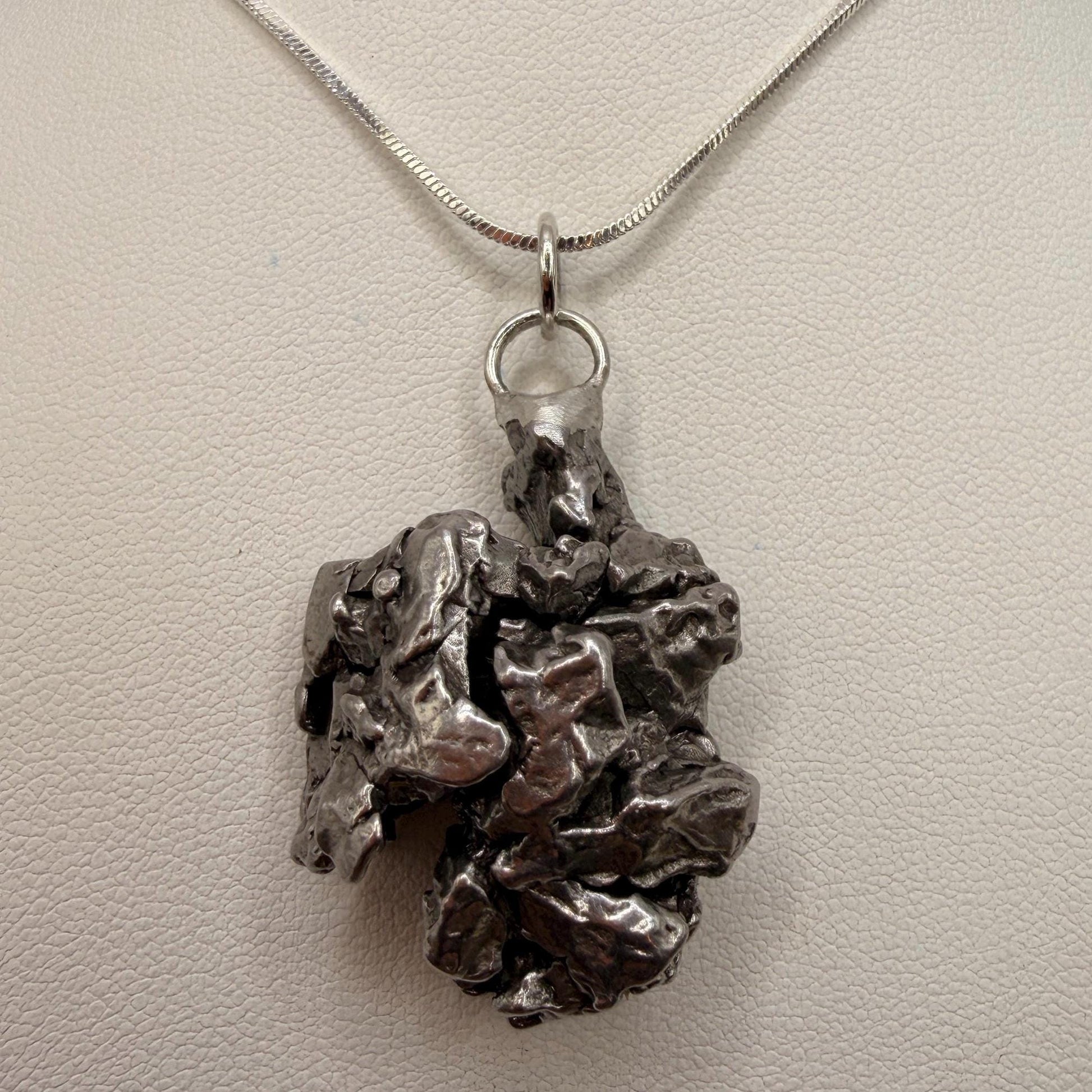 Gorgeous Meteorite Campo Del Cielo Pendant. This one has such a unique shape with amazing features. Has a rare moving piece which can be viewed in the video. The weight is 26.24 grams the meteorite is 1.0” long and 1.0” wide. It comes with a complimentary 20” sterling silver snake chain or 18” leather necklace, you choose. It also comes with a certificate of authenticity. The perfect unique gift for those interested in Science-Fi and Space. This meteorite is gorgeous, fully regmaglypted, with no rust! Looks amazing in the sunlight and will be sure to get attention. Free shipping!