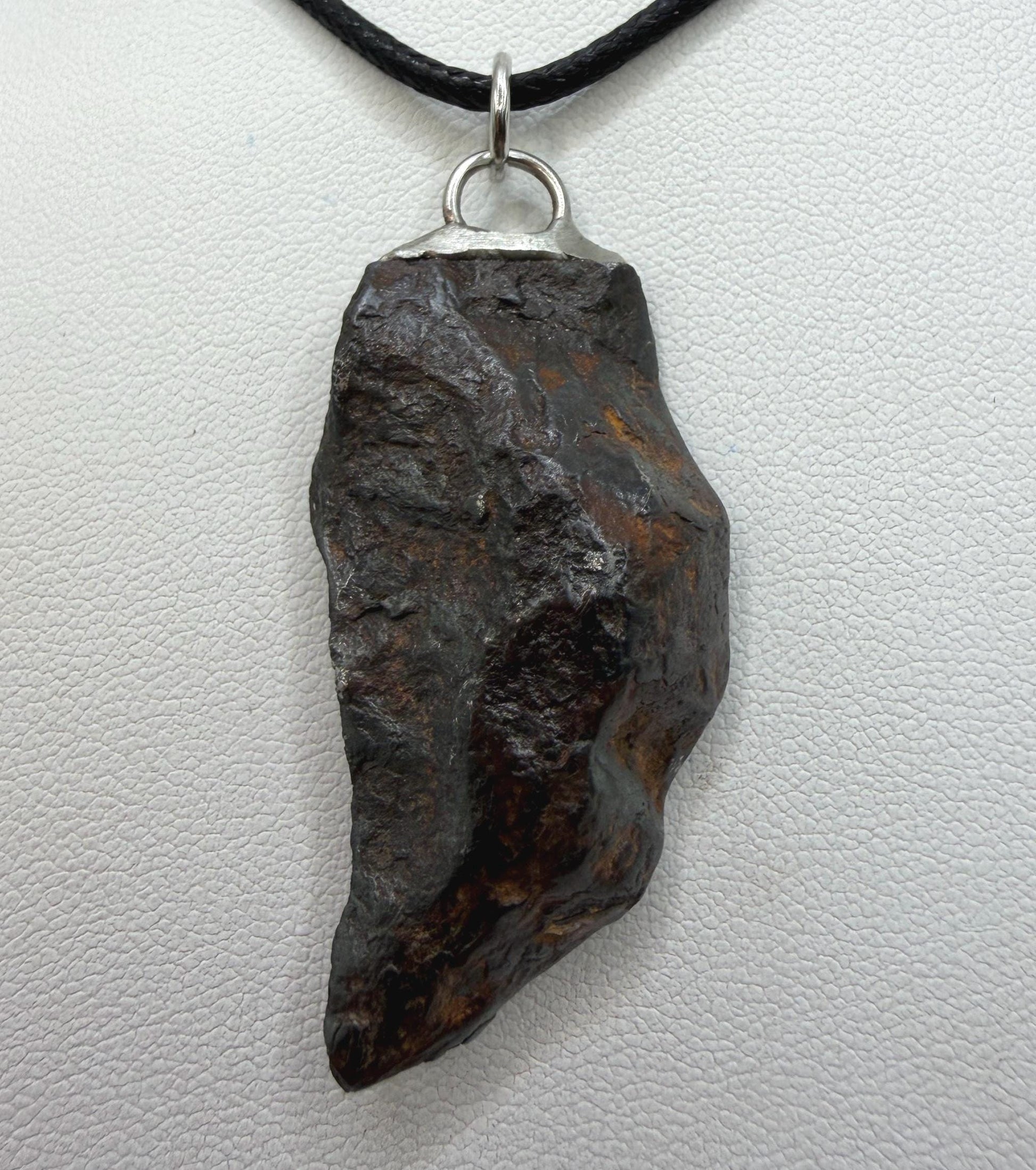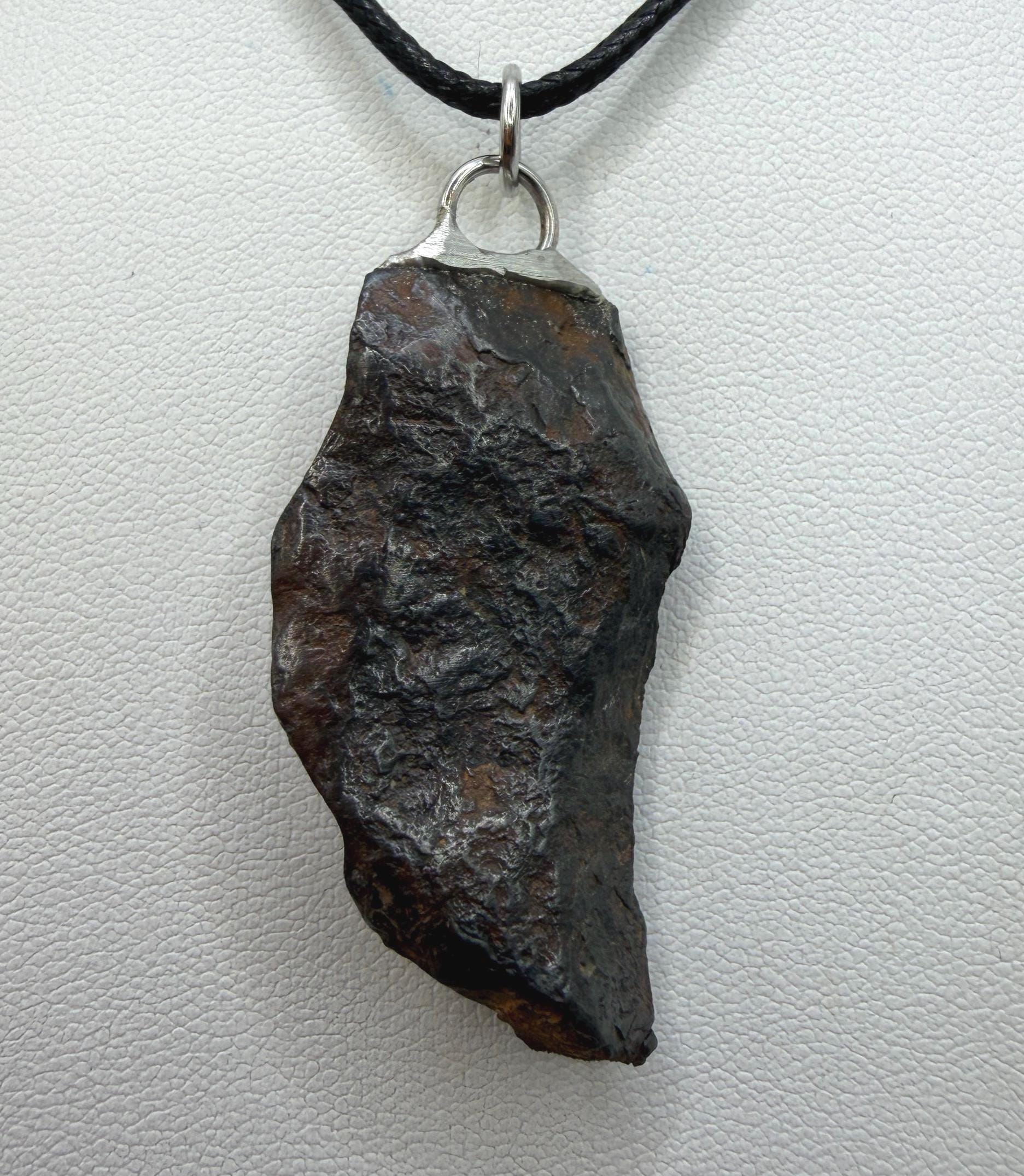 Canyon Diablo Meteorite Pendant. This one has such a unique shape with amazing features. The weight is 23.34 grams the meteorite is 1.50” long and 0.75” wide. Comes with complimentary silver snake chain and leather necklace. The perfect unique gift for those interested in Science-Fi and Space. Such a unique meteorite that will surely get you attention. Free shipping!