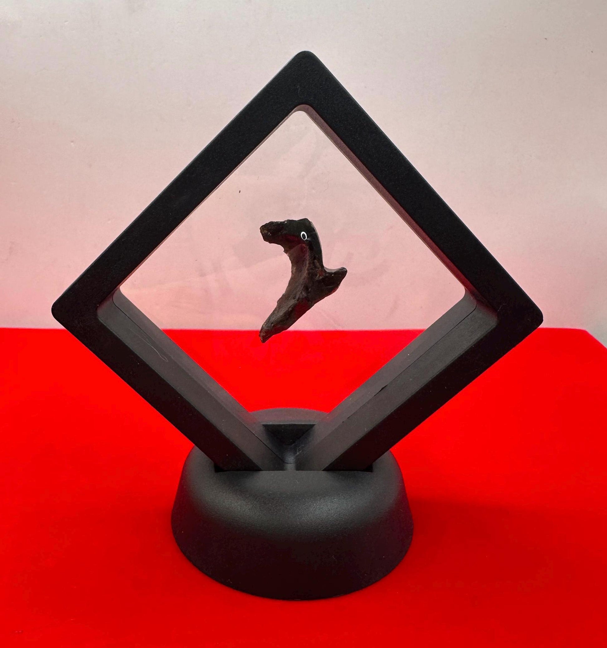 This is a beautiful Darwin Glass tektite, weighing 2.21 grams. This unique gemstone originates from the heart of Tasmania, Australia, formed by the impact of a meteorite that melted terrestrial materials to create a natural glass full of history and mystery. Darwin Glass is characterized by its fascinating greenish to black hues and the intriguing patterns that dance across its surface, each piece telling a story of cosmic power and terrestrial transformation. Its formation, dating back approximately 816,000 years, speaks to a moment of incredible force, making it a prized specimen for both collectors and scientists alike. The scarcity of Darwin Glass, coupled with its distinct appearance and geological significance, marks it as a standout addition to any collection. This beautiful Darwin Glass tektite comes with a display case.