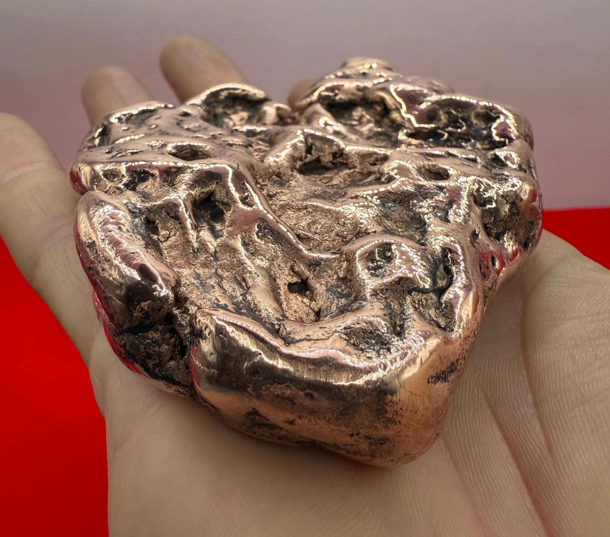 This is a beautiful large high quality Keweenaw Michigan Native “Float” Copper nugget. Some of the finest and high quality copper comes from Michigan. Looks very much like a Natural Human Heart. The measurements of this nugget is 3.75” long and 3.0” wide. The weight is 1 lb 2 ounces or 510 grams.