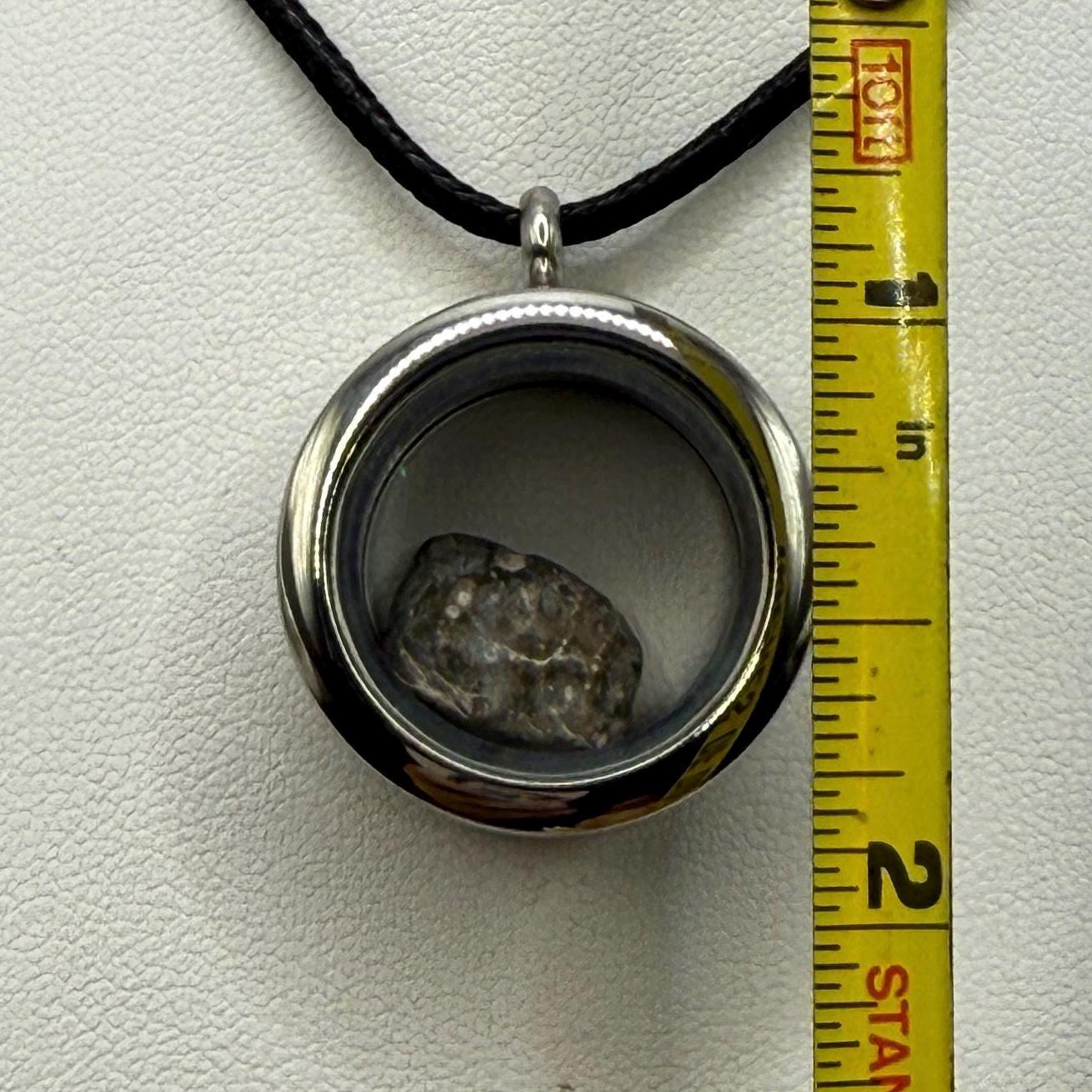 The pendant design includes a screw-cap closure for secure protection and easy access to the meteorite. Its dimensions are just under 1.0 inch wide and 0.50 inches thick, making it a perfect size to wear comfortably while showcasing a piece of the Moon. The tempered glass allows a clear view of the meteorite’s surface, which exhibits beautiful rugged textures and delicate craters, a testament to its incredible journey through the cosmos. Unlike many lunar specimens, this meteorite is harder and more durable, ensuring it remains a timeless keepsake for generations.