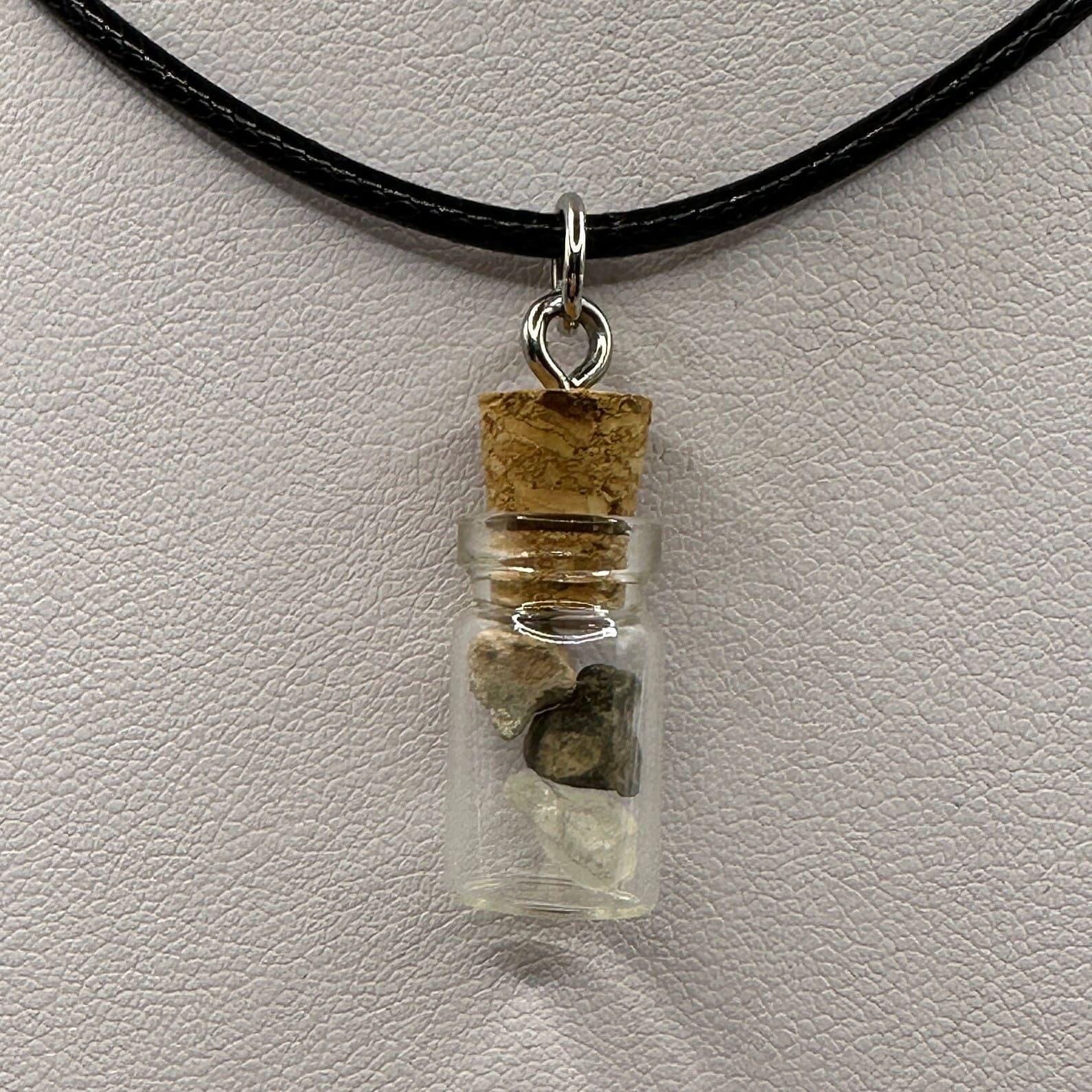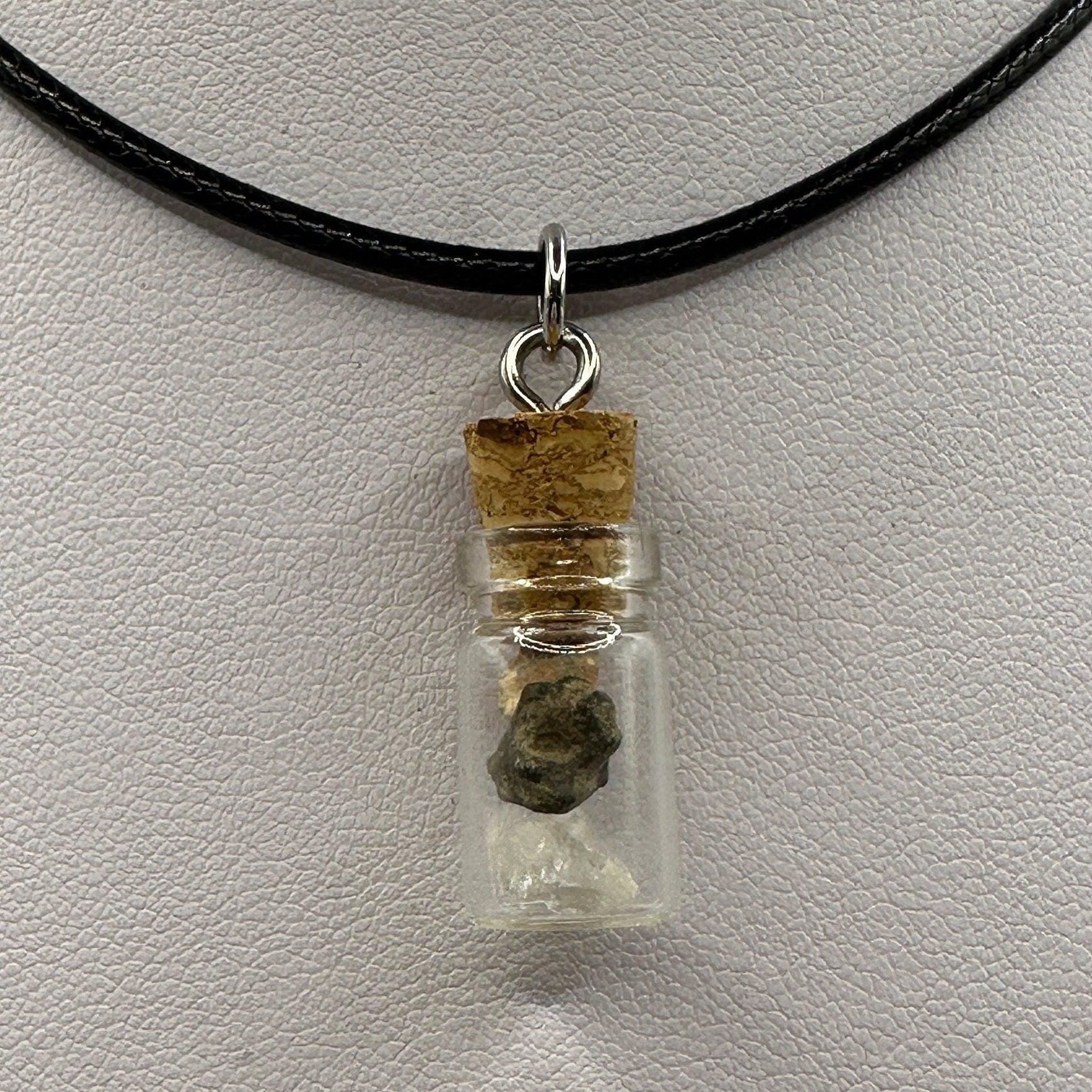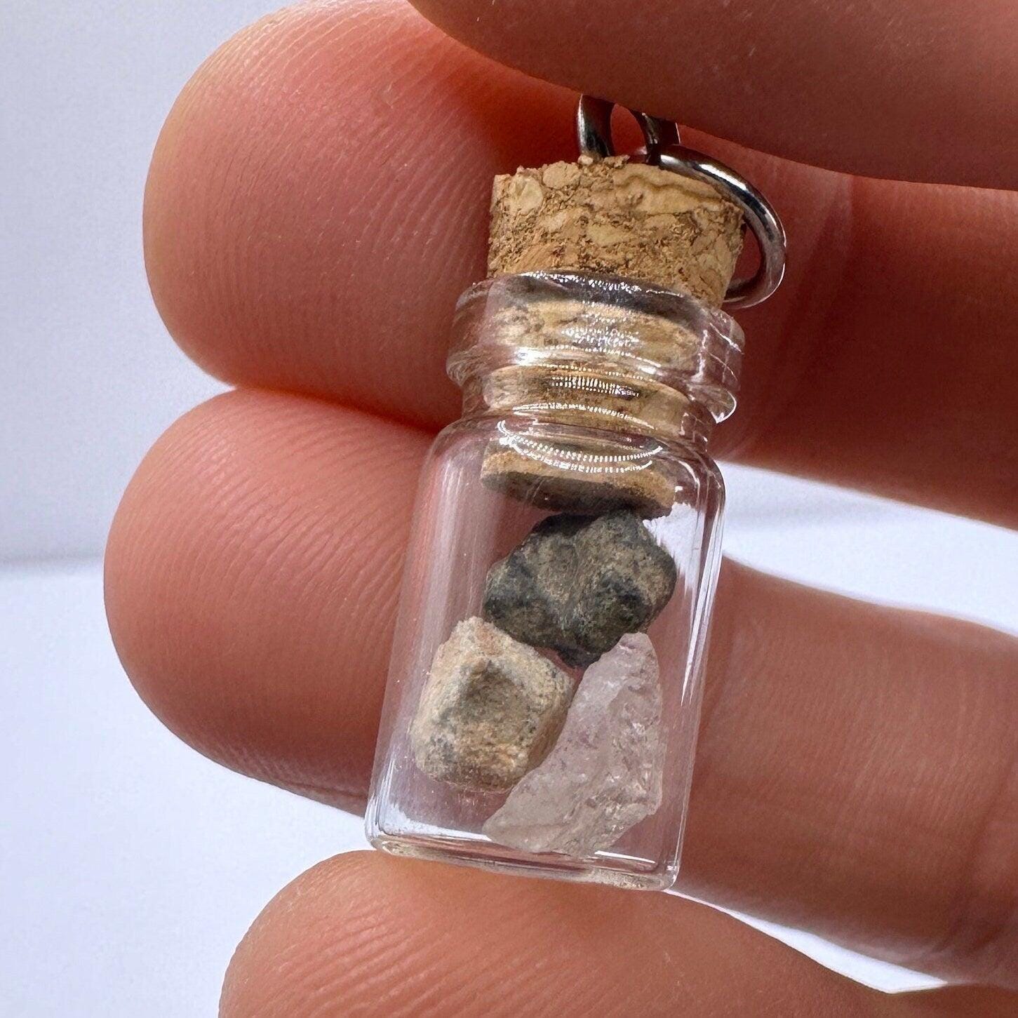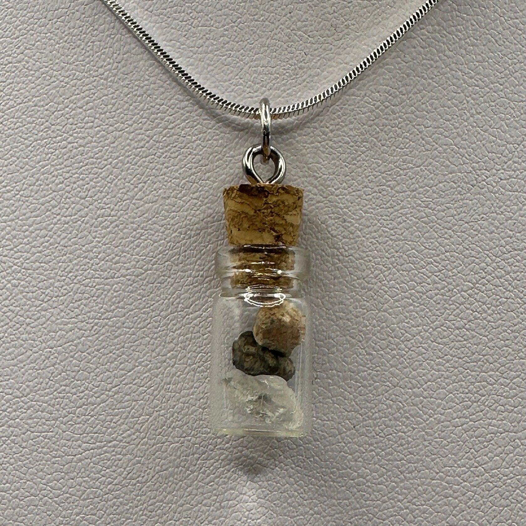 Moon, Mars and Earth in a Bottle Pendant, Mars Shergottite, Bechar 007 Moon Meteorite, Nigerian Phenacite, Handmade Pendant, Astronomy Gift