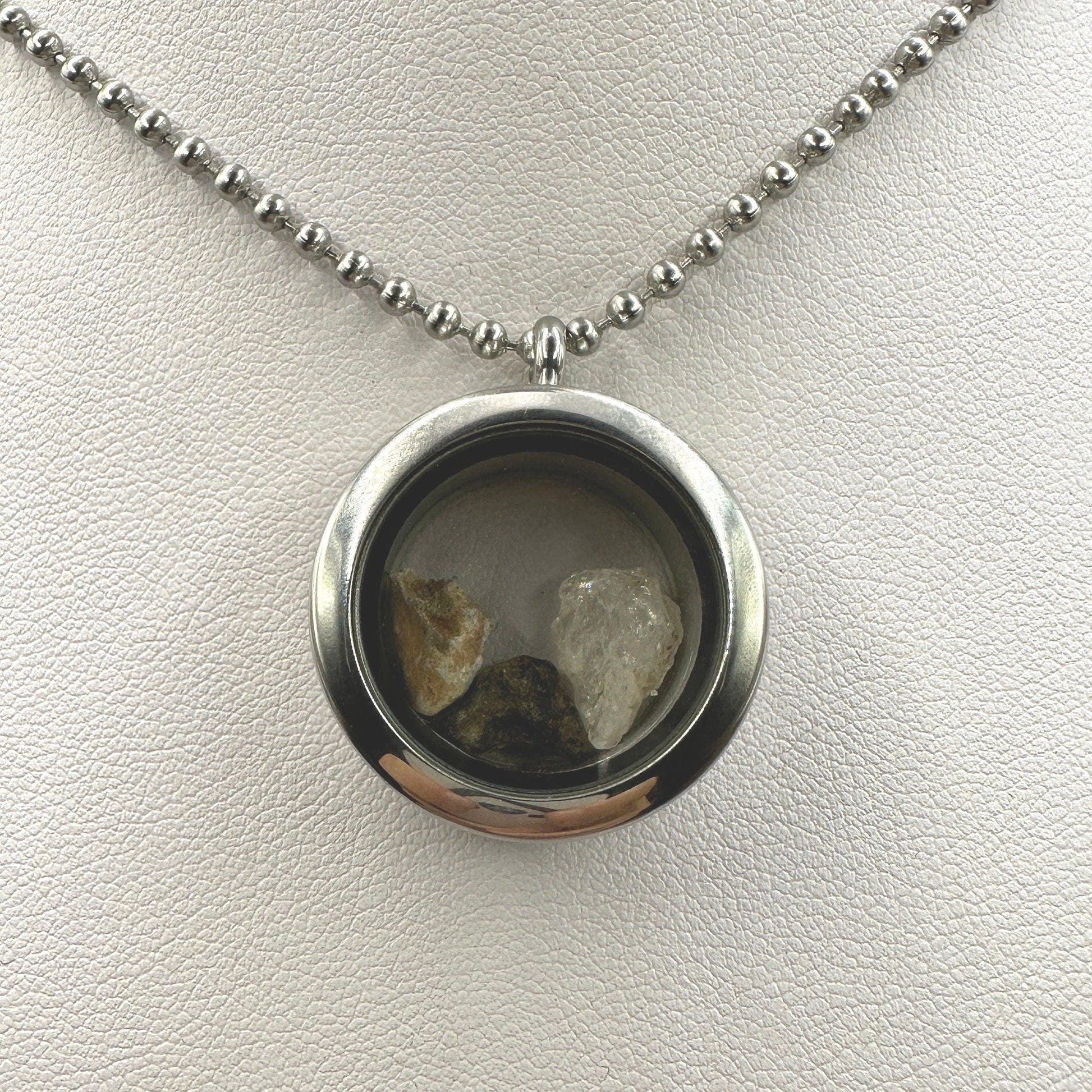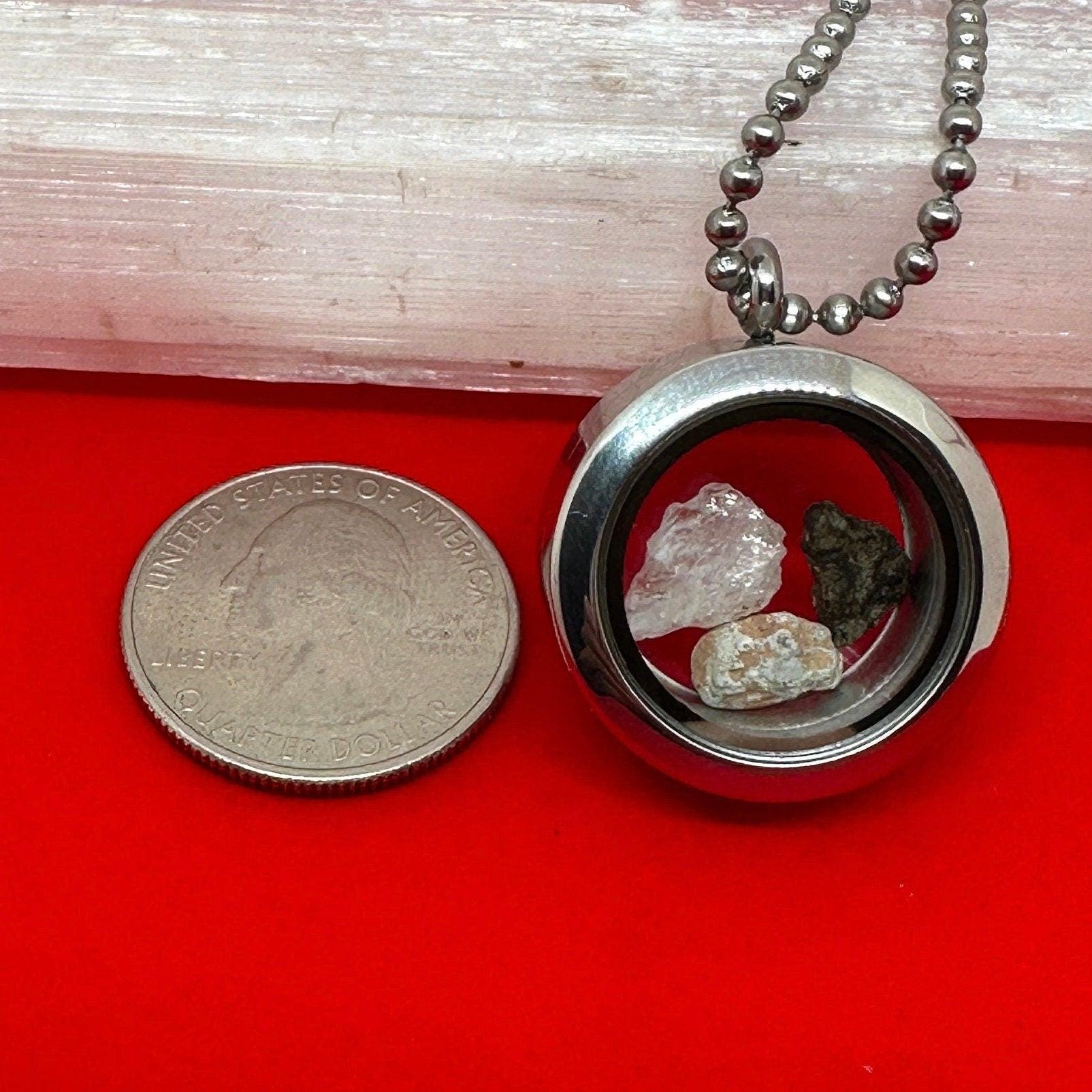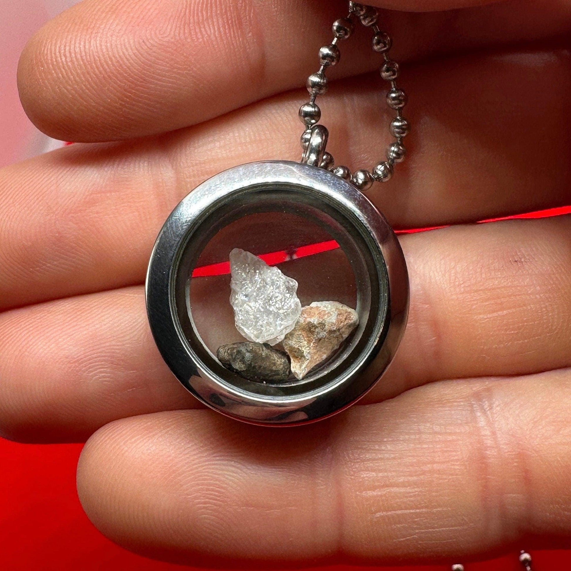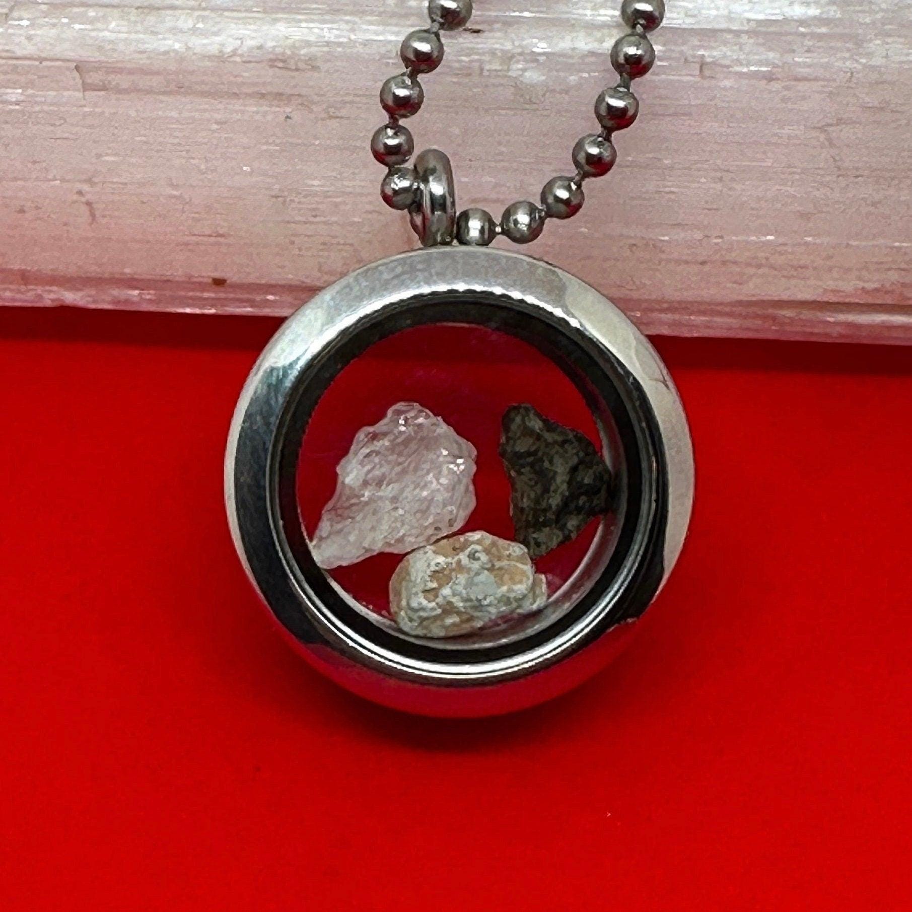 Moon, Mars and Earth in a Floating Locket, Mars Shergottite, Bechar 007 Moon Meteorite, Nigerian Phenacite, Handmade Locket, Astronomy Gift