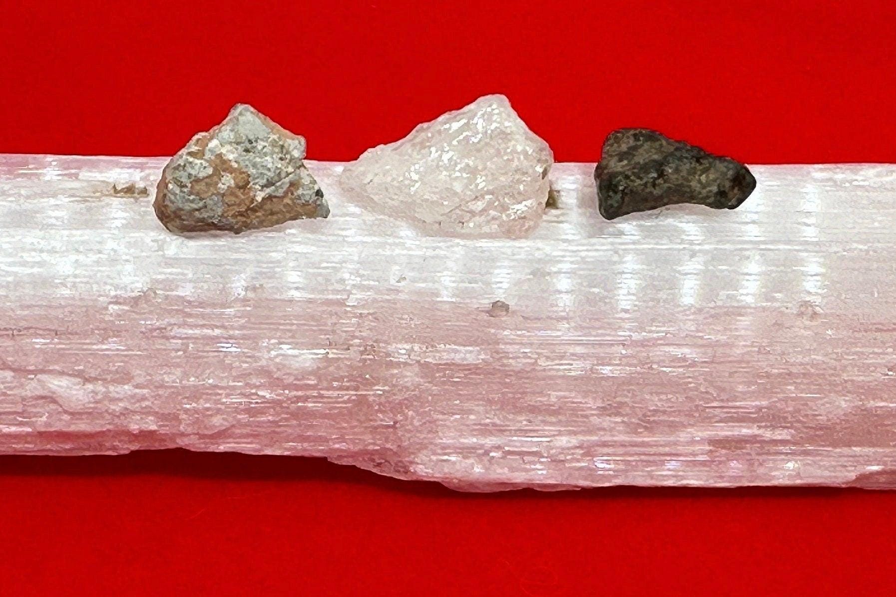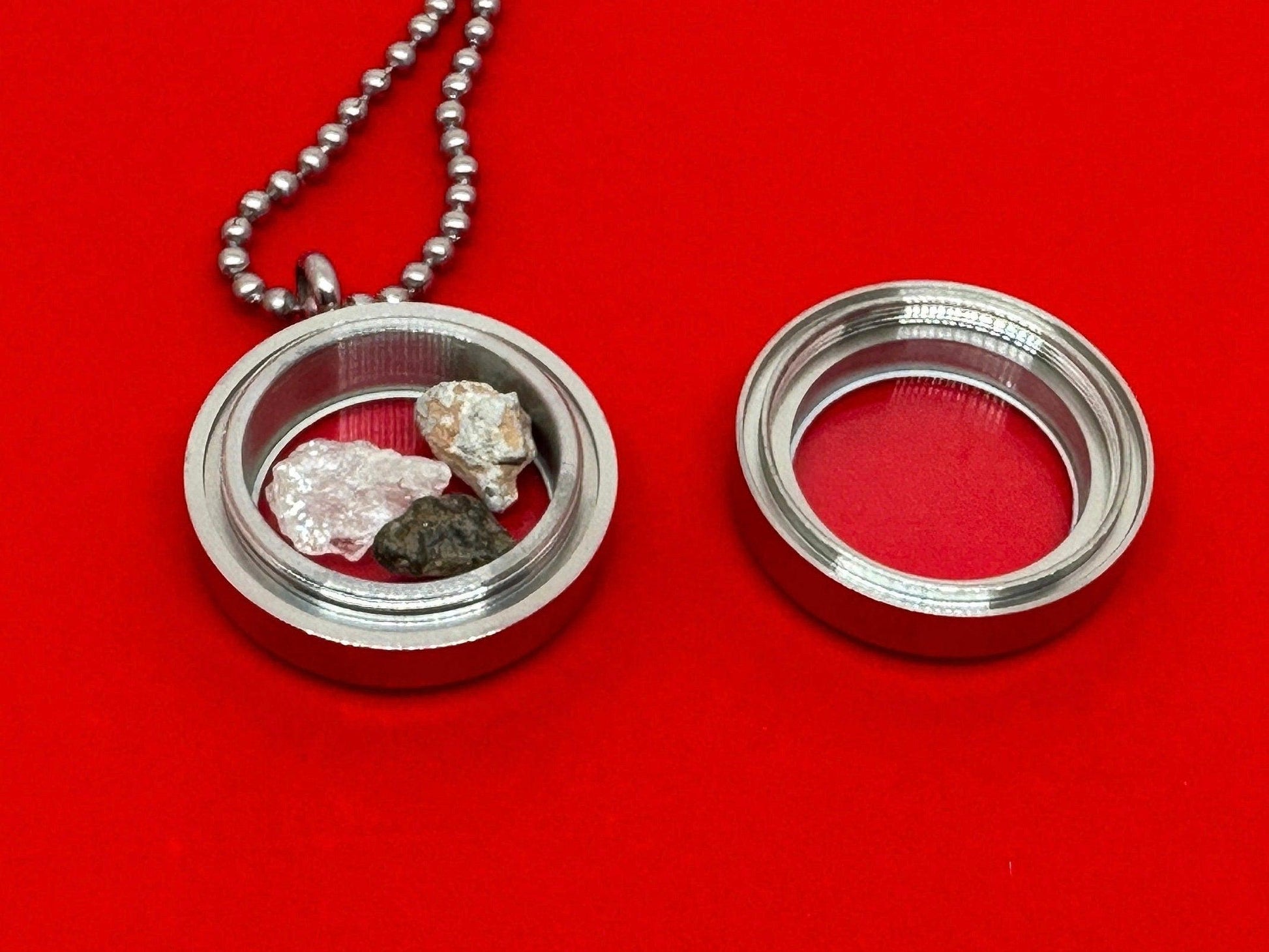 At its core, this pendant showcases three magnificent specimens: Bechar 007, the lunar meteorite from the Moon, Shergottite, the Martian meteorite from Mars, and Phenacite, a captivating crystal representing our beloved Earth. Each individual element possesses a unique story and imbues the pendant with its own distinctive energy.