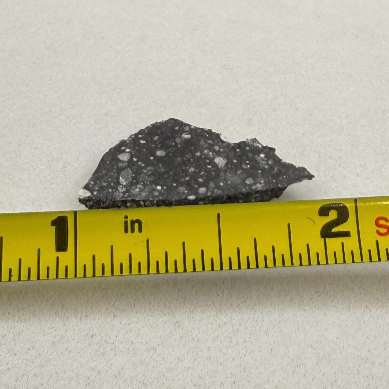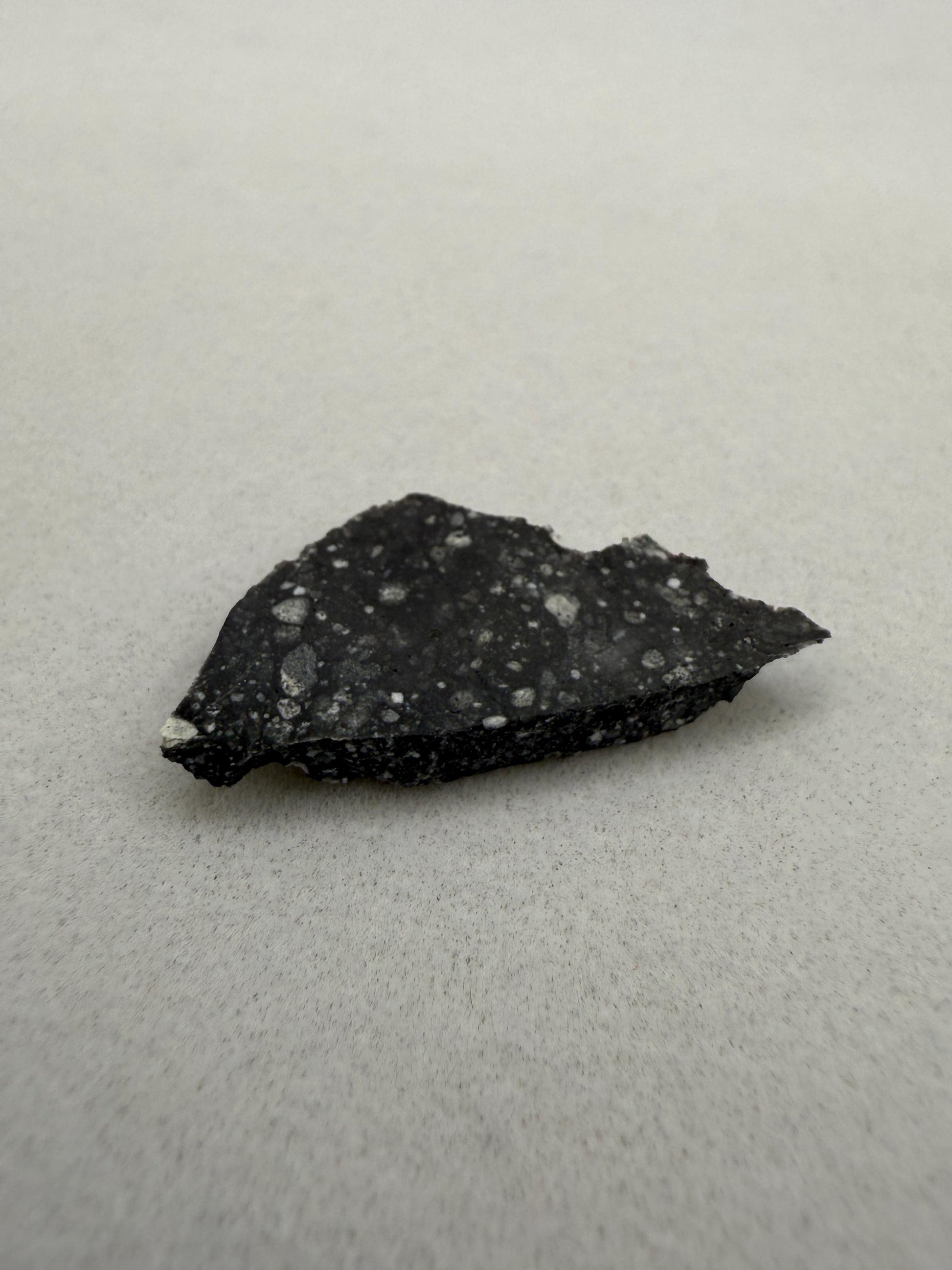 This full slice weighs 0.69 grams and measures approximately 1.0 inches long and just under 0.50 inches wide, offering an impressive and elegant display. It is a feldspathic lunar breccia, characterized by its striking brecciated matrix and contrasting clasts—classic signatures of the Moon’s highland terrain, formed from repeated meteoritic impacts that shattered and fused its crust over billions of years.