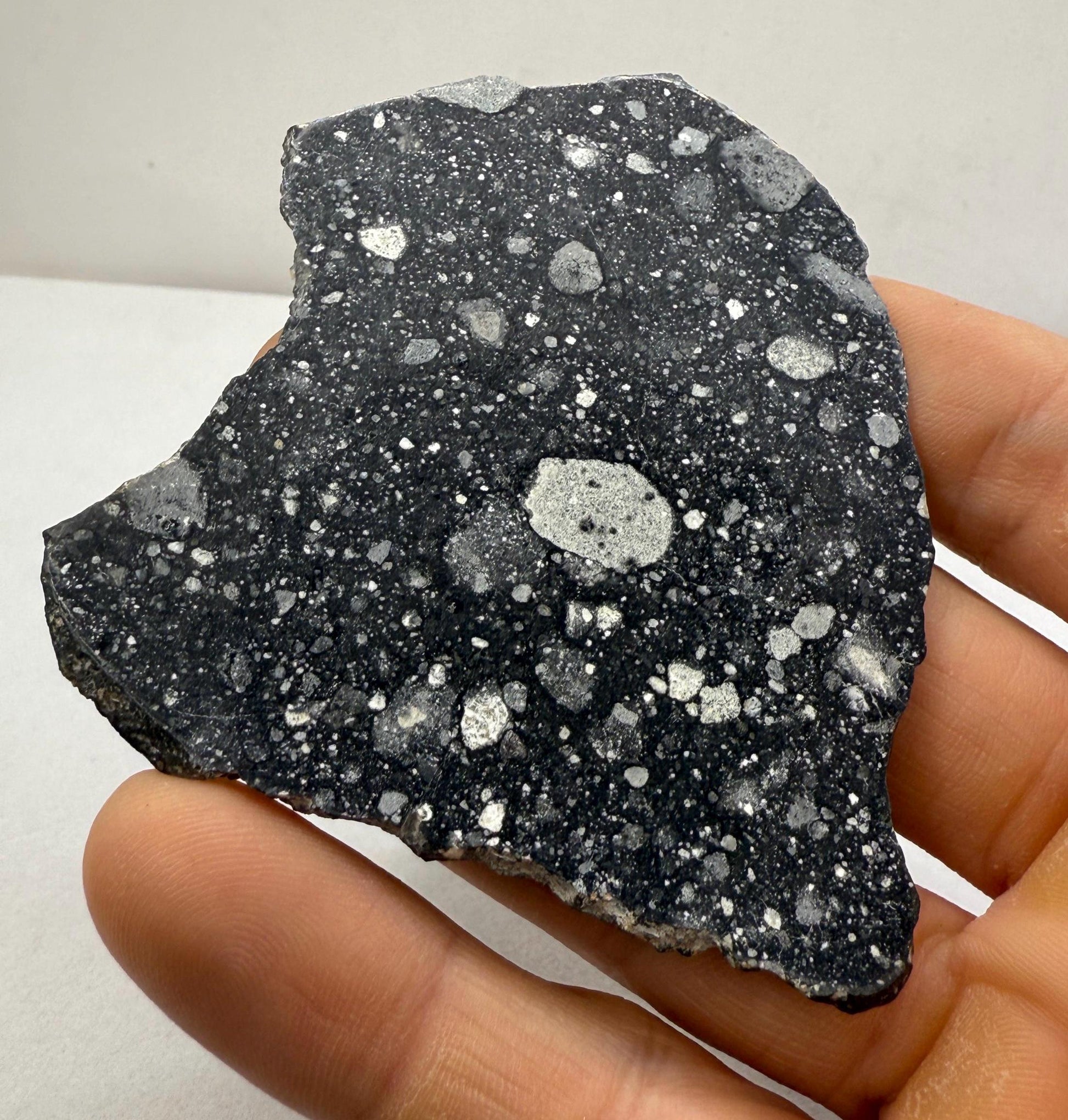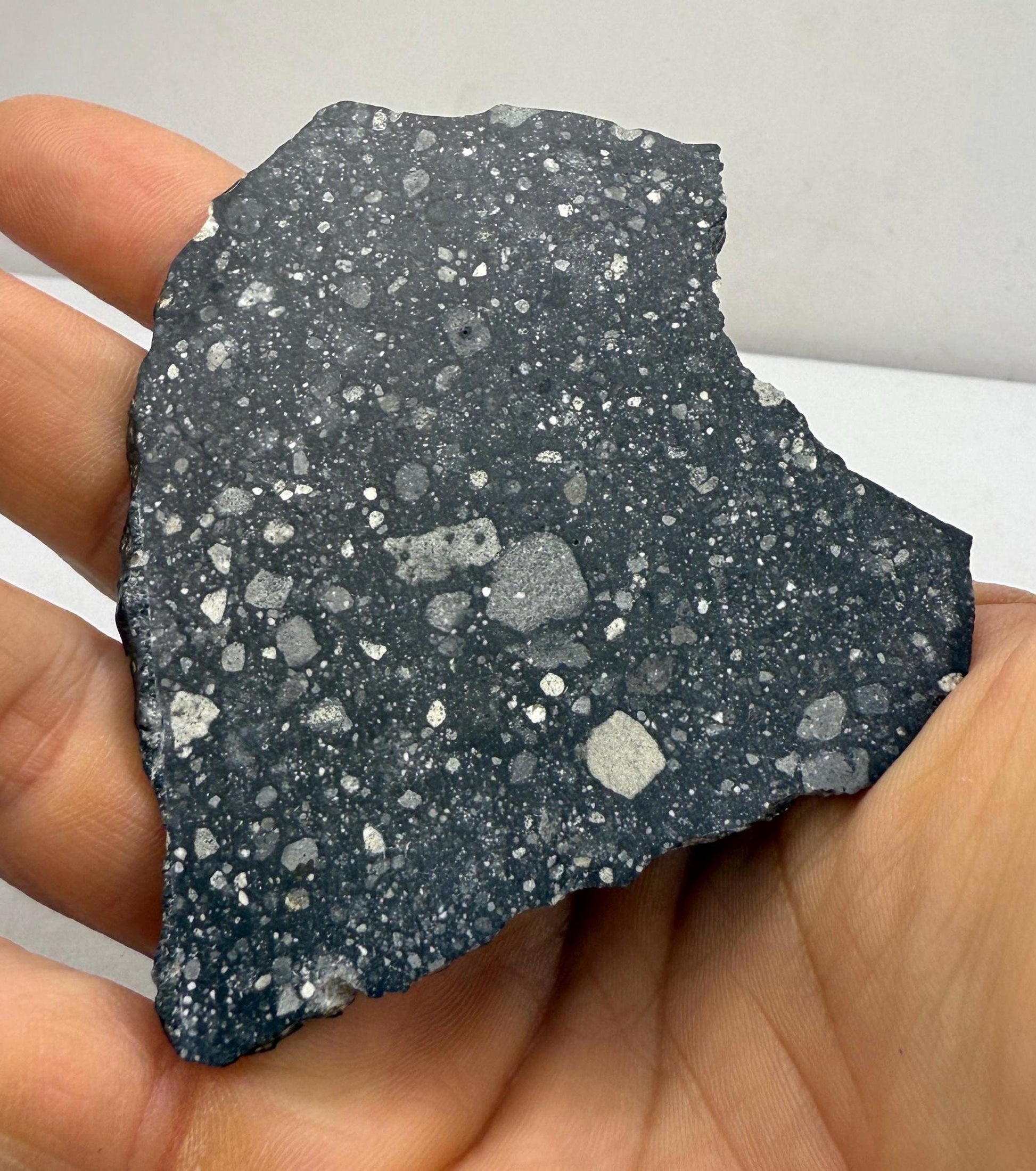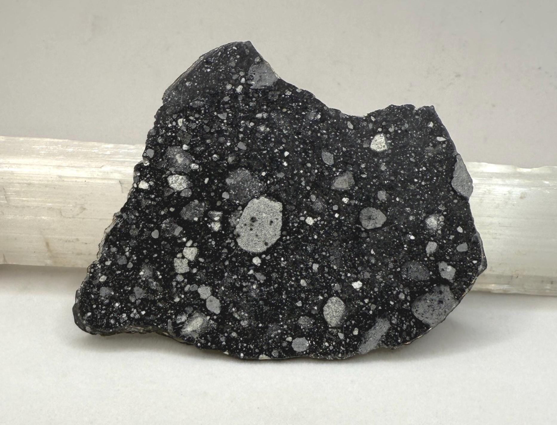 This full slice weighs 23.42 grams and measures 3.0 inches long by 2.5 inches wide, making it an ideal size for display and admiration. Feldspathic breccias are composed primarily of plagioclase fragments, forged from intense meteoritic impacts on the Moon’s crust over billions of years. Each slice is a one-of-a-kind natural record of lunar history.