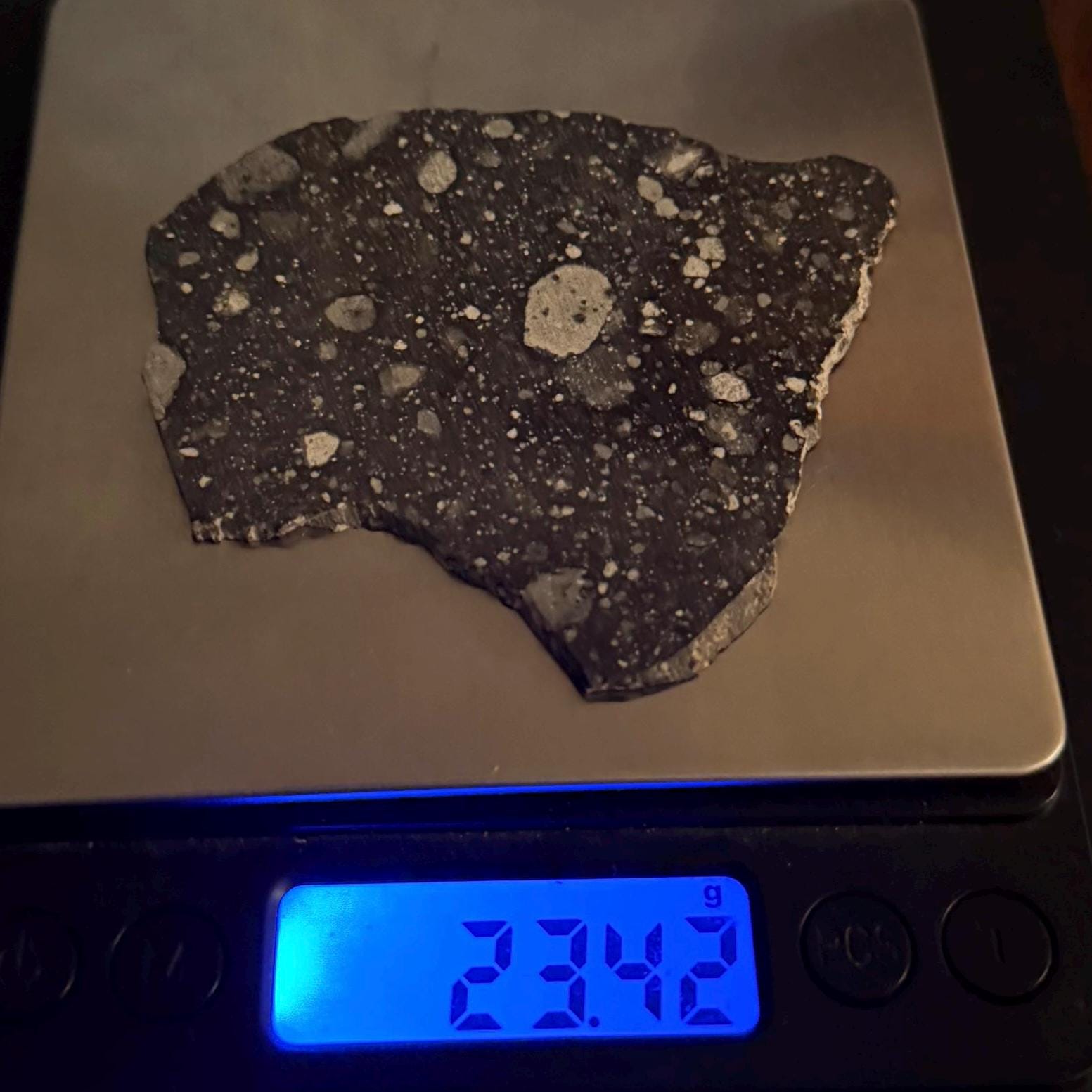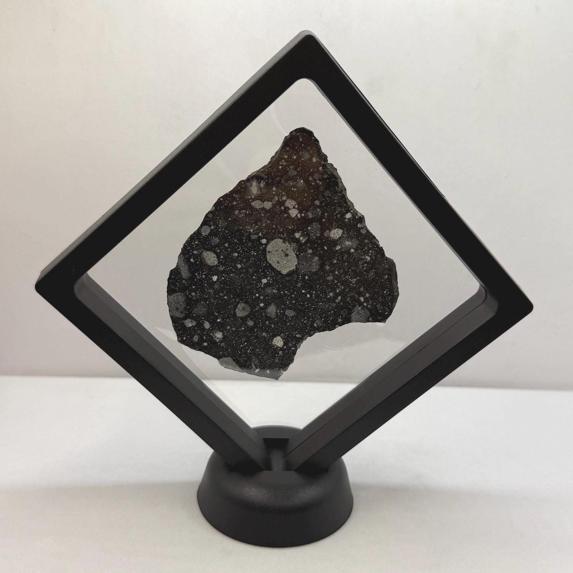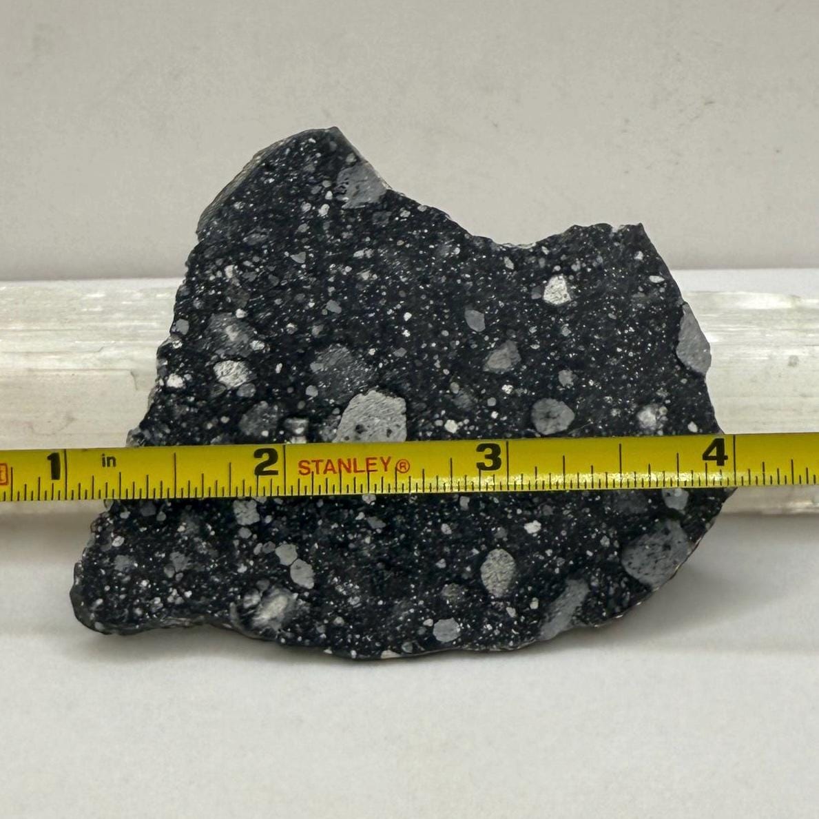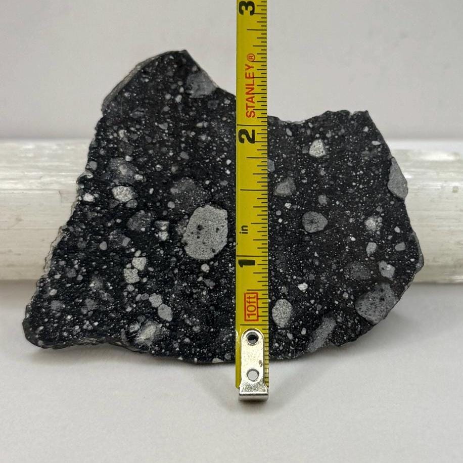 This full slice weighs 23.42 grams and measures 3.0 inches long by 2.5 inches wide, making it an ideal size for display and admiration. Feldspathic breccias are composed primarily of plagioclase fragments, forged from intense meteoritic impacts on the Moon’s crust over billions of years. Each slice is a one-of-a-kind natural record of lunar history.