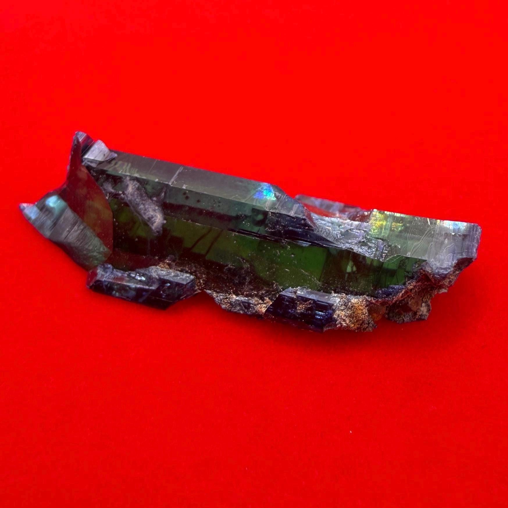 Introducing our stunning Vivianite Crystal from Brazil, a gem of unparalleled beauty and rarity. This beautiful Vivianite Crystal comes with a display case and a velvet carrying. This exquisite crystal weighs 4.61 grams/23.05 carats and boasts a mesmerizing deep green hue, a testament to its pristine quality and natural allure. Vivianite is a unique iron phosphate mineral known for its intense color and striking transparency. The deep green of this particular specimen evokes the lush forests of Brazil, capturing the essence of nature's beauty in a single, breathtaking crystal.