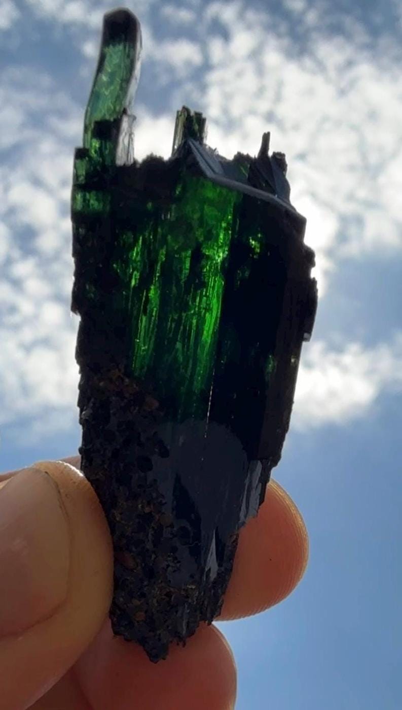 Introducing our stunning Vivianite Crystal from Brazil, a gem of unparalleled beauty and rarity. This beautiful Vivianite Crystal comes with a display case and a velvet carrying. This exquisite crystal weighs 21.10 grams/105.5 carats and boasts a mesmerizing deep green hue, a testament to its pristine quality and natural allure. Vivianite is a unique iron phosphate mineral known for its intense color and striking transparency. The deep green of this particular specimen evokes the lush forests of Brazil, capturing the essence of nature's beauty in a single, breathtaking crystal.