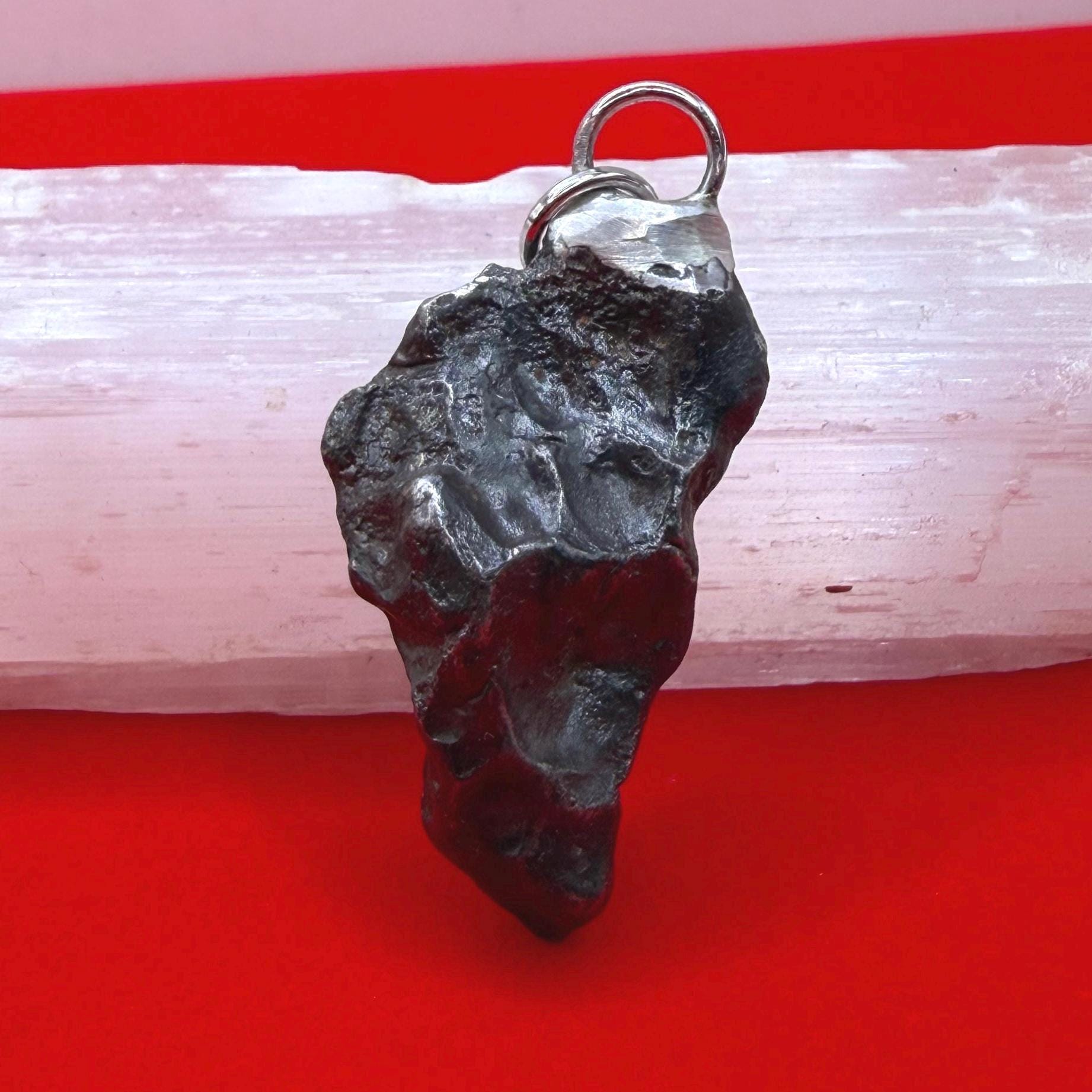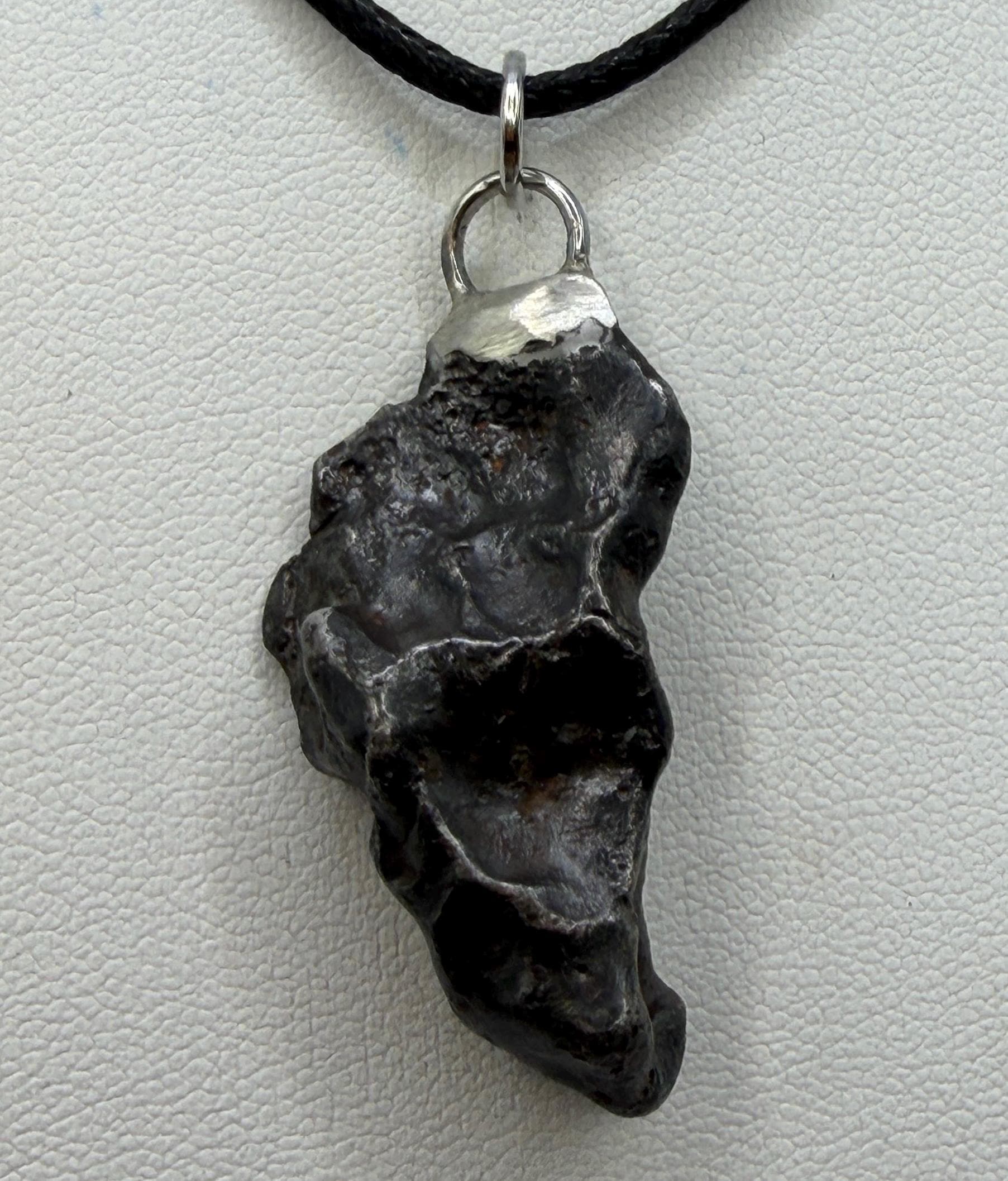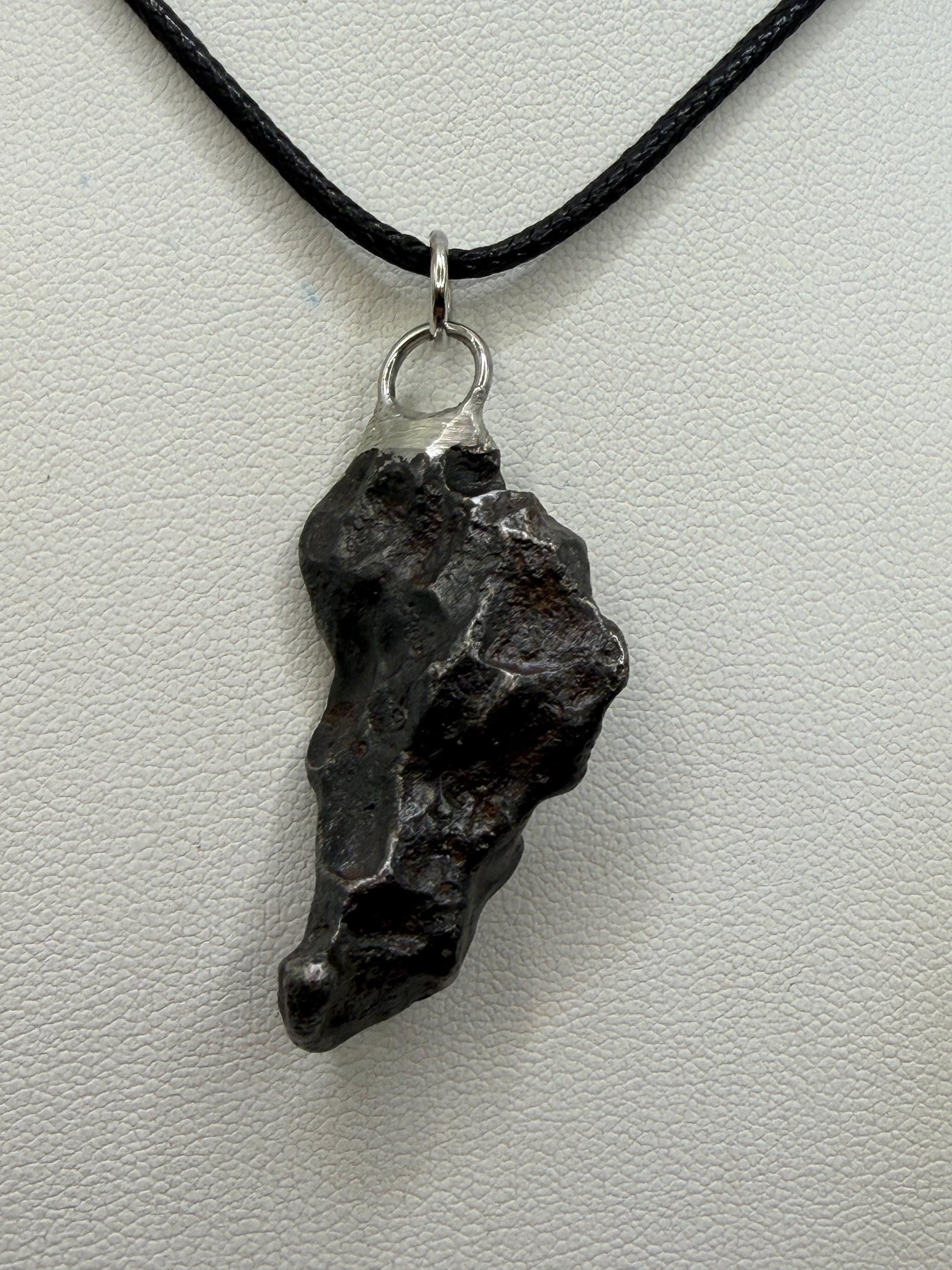 Sikhote-Alin Meteorite Pendant. This one has such a unique shape with amazing features. The weight is 16.75 grams the meteorite is 1.25” long and 0.75” wide. It comes with a complimentary 20” sterling silver snake chain or 20” leather necklace, you choose. The perfect unique gift for those interested in Science-Fi and Space. Such a unique meteorite that will surely get you attention. Free shipping!