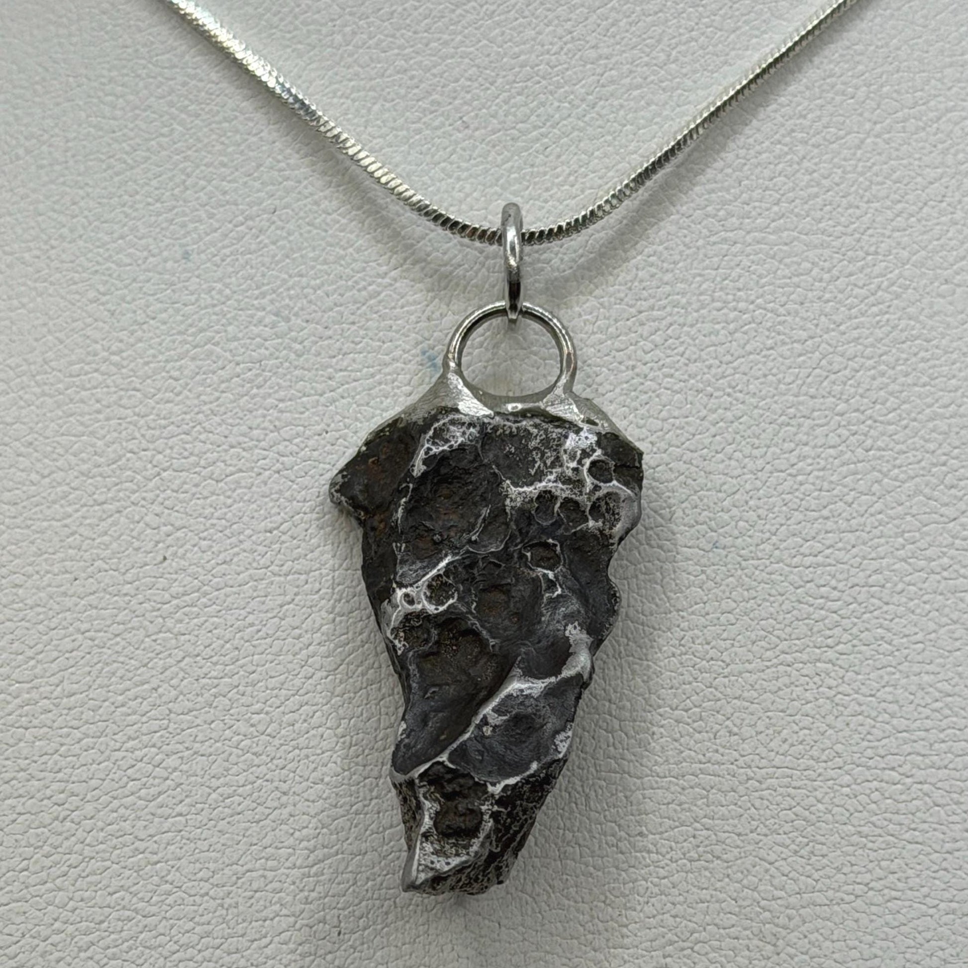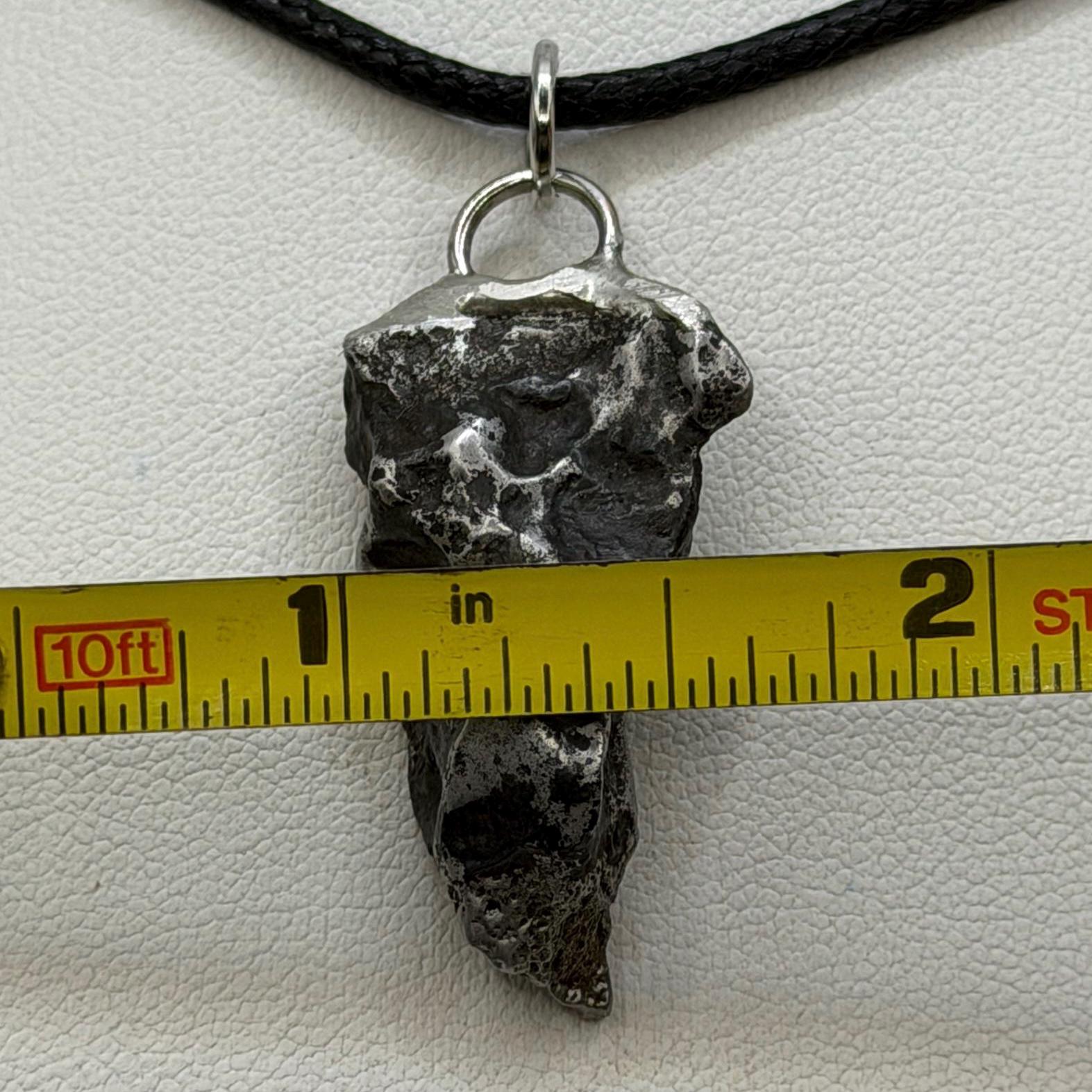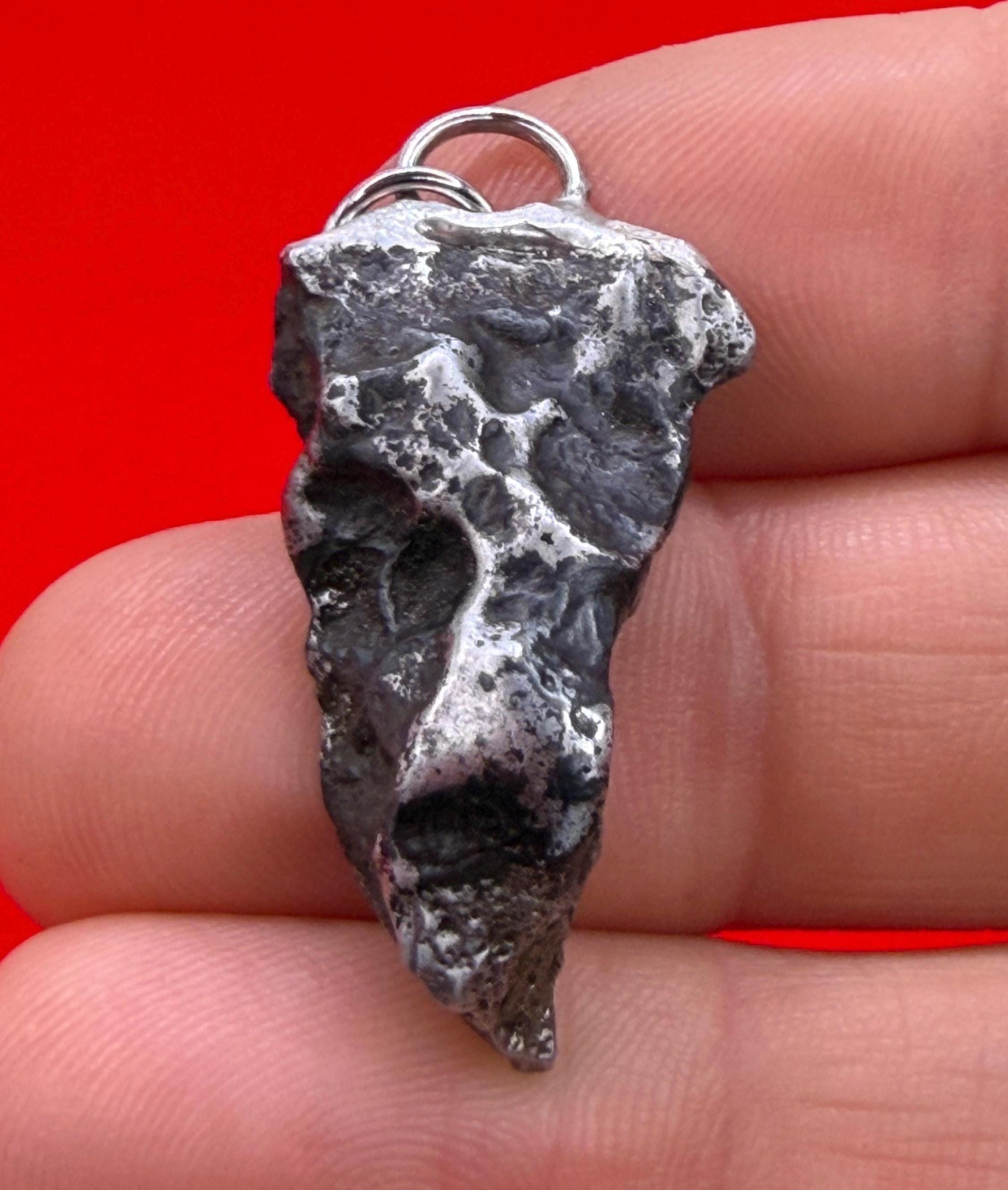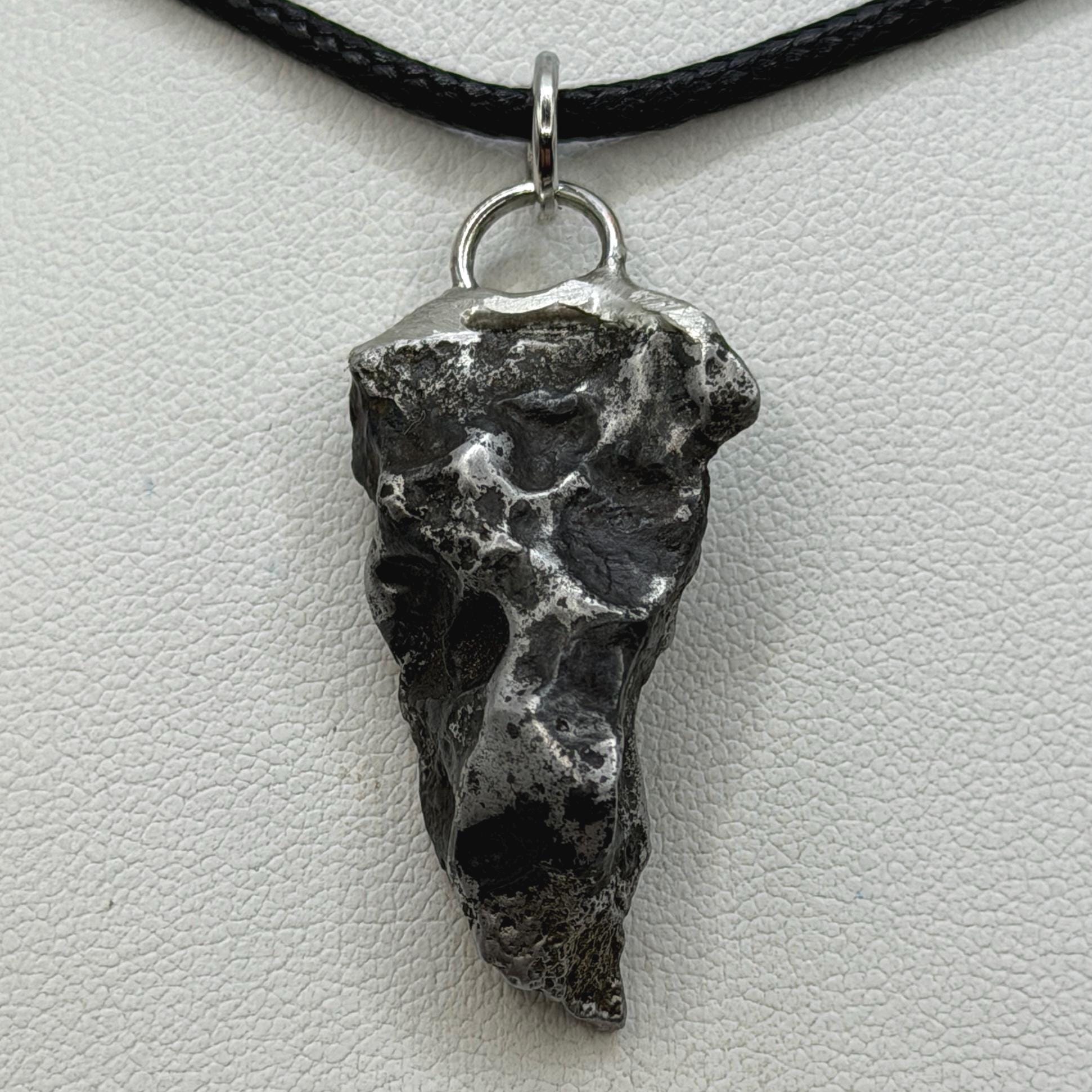 Sikhote-Alin Meteorite Pendant. This one has such a unique shape with amazing features. The weight is 9.51 grams the meteorite is 1.25” long and 0.50” wide. It comes with a complimentary 20” sterling silver snake chain or 20” leather necklace, you choose. The perfect unique gift for those interested in Science-Fi and Space. Such a unique meteorite that will surely get you attention. Free shipping!