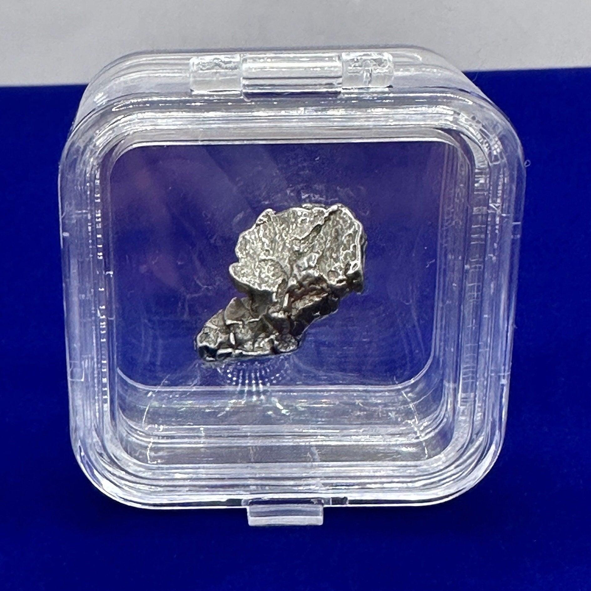 Tiny Campo Del Cielo Meteorite specimen 11.32 grams with a tiny display case, velvet carrying bag and a certificate of authenticity. A very unique airplane shaped meteorite. Beautiful museum grade meteorite. It would be a great meteorite to start any collection. This one has a unique shape and has a beautiful shine. Perfect gift for a meteorite enthusiast or collector. Need a birthday gift for a space loving student? This would make a very unique stocking stuffer or gift. The display case is small enough to fit in your pocket. The measurements are just over 0.75” long and just over 0.50” wide.