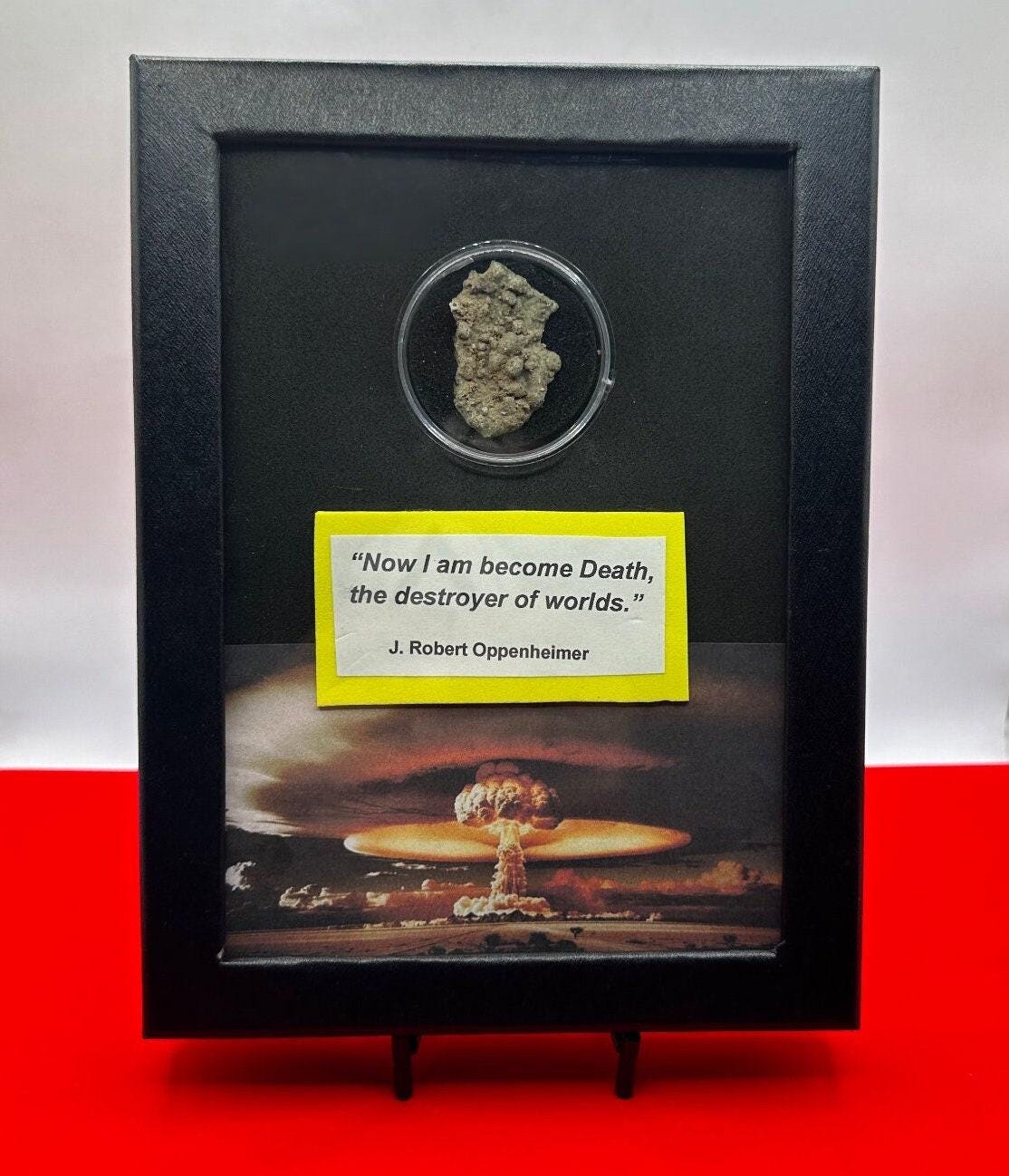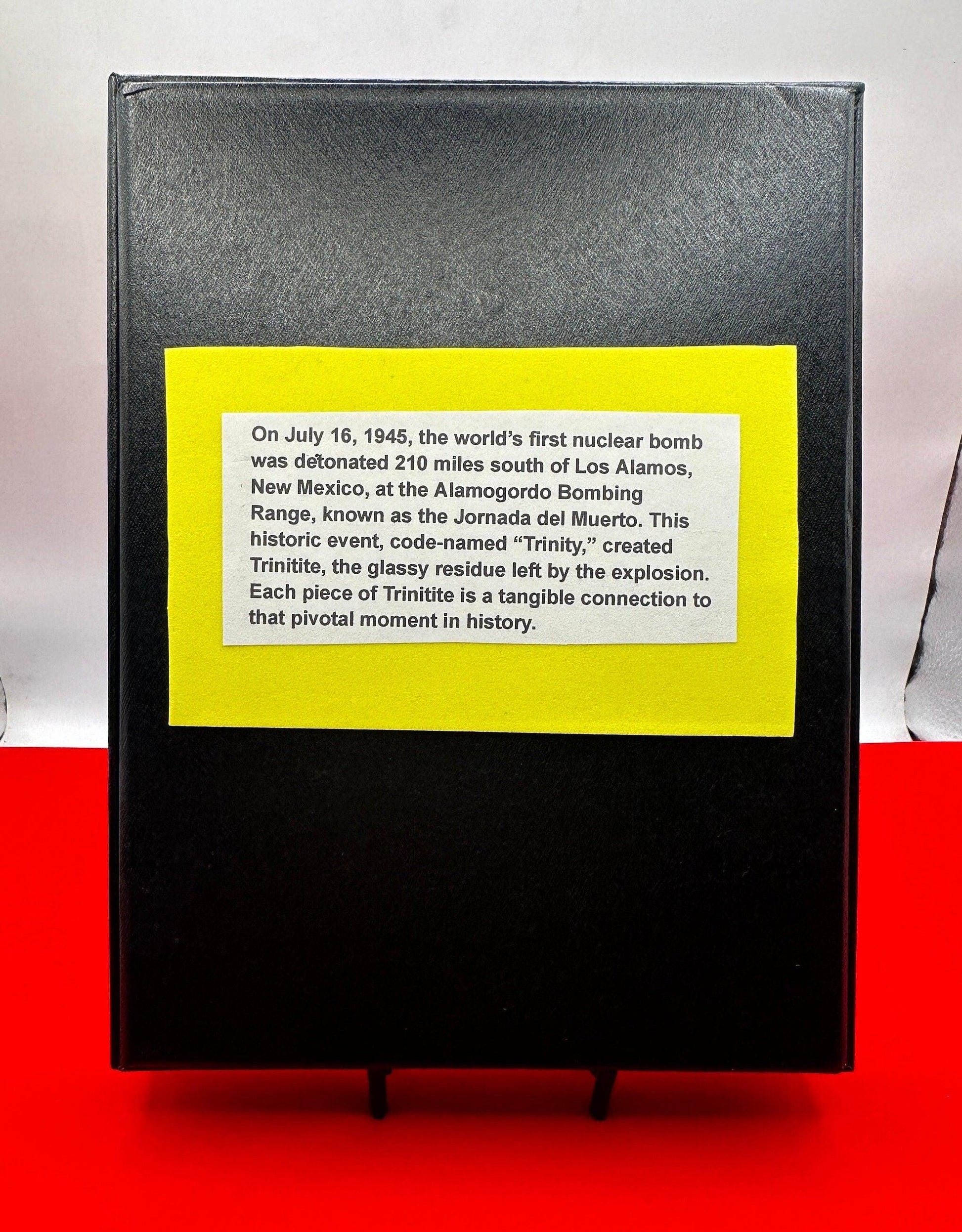Discover a piece of history with this captivating Trinitite specimen, a rare and unique artifact formed from the world's first atomic bomb test. On July 16, 1945, in the desert of New Mexico, the U.S. conducted the Trinity test, which marked the dawn of the atomic age. The intense heat of the explosion melted the desert sand, creating this remarkable glass-like mineral, aptly named Trinitite. Each piece tells a story, encapsulating the fusion of nature and human ingenuity. This beautiful Trinitite Specimen comes with a display case and an information sheet. Trinitite is for scientific and educational purposes. An excellent addition to any collection. This beautiful Trinitite specimen comes with a presentation informative display and a cast iron stand. (Can be viewed in the photos.)