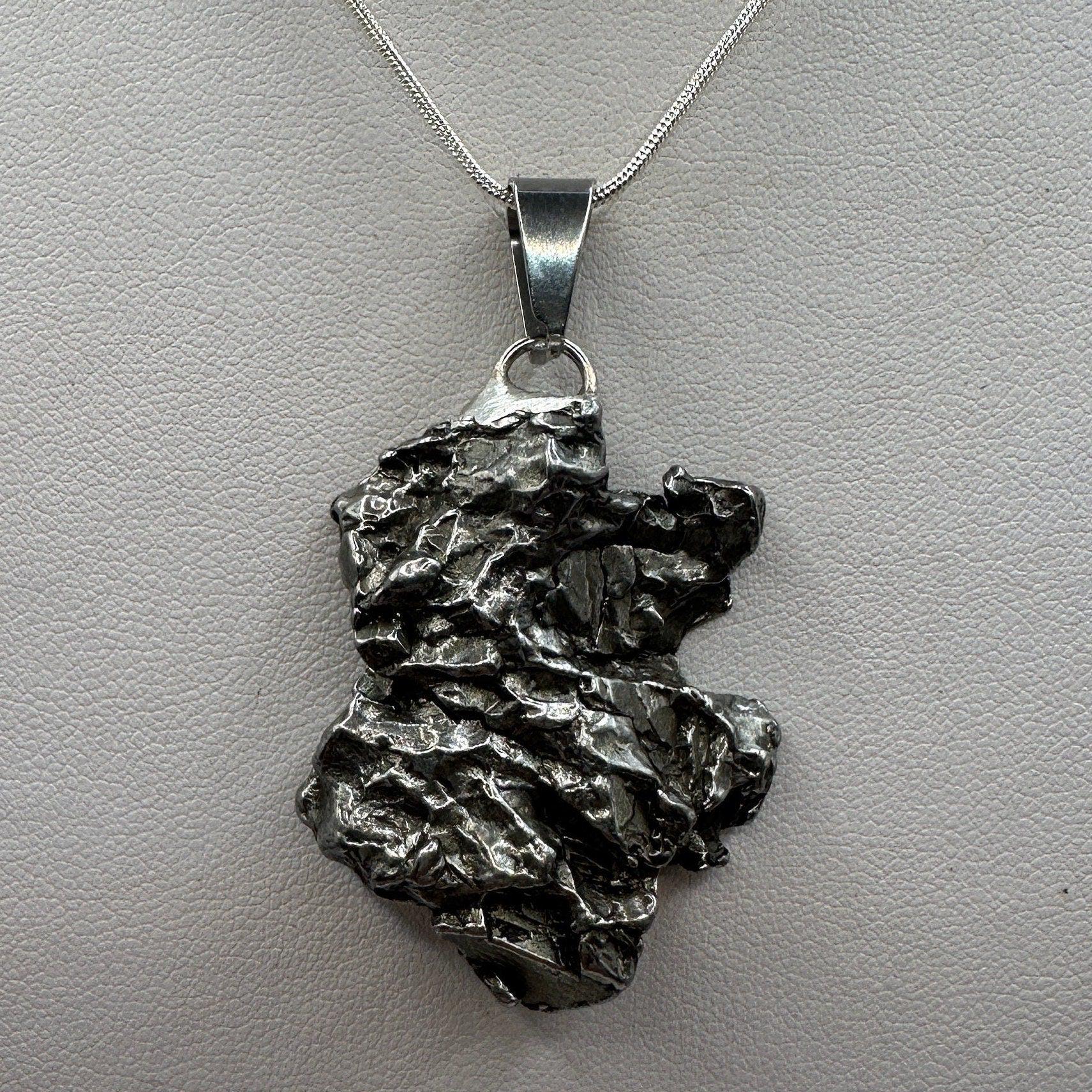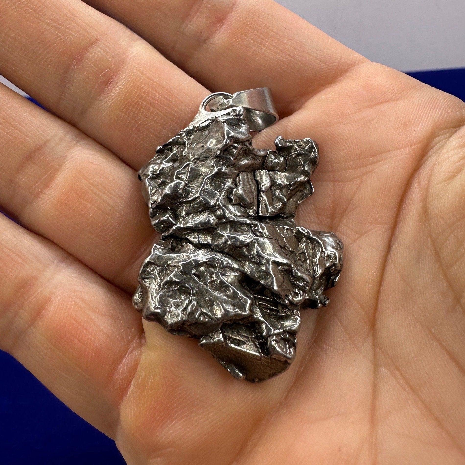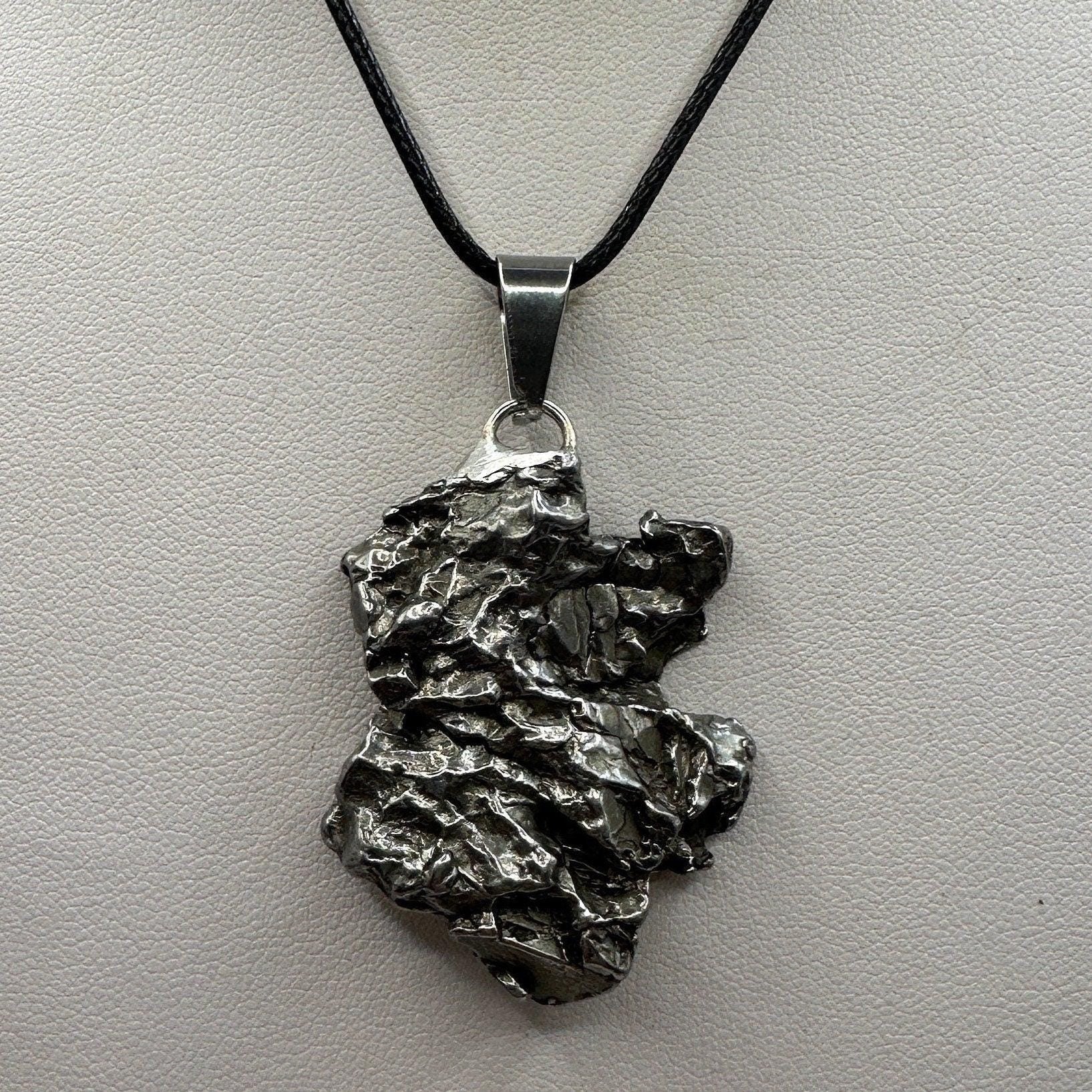 Unique Campo Del Cielo Meteorite Meteorite Pendant. This one has such a unique shape with amazing features. Has a unique shape with a rare moving part. (View in video). The weight is 36.17 grams the meteorite is 2.0” long and 1/2” wide. It comes with a complimentary 22” sterling silver snake chain or 20” leather necklace. The perfect unique gift for yourself or loved one. This meteorite is gorgeous, fully regmaglypted, with no rust! Looks amazing in the sunlight and will be sure to get attention. Free shipping!