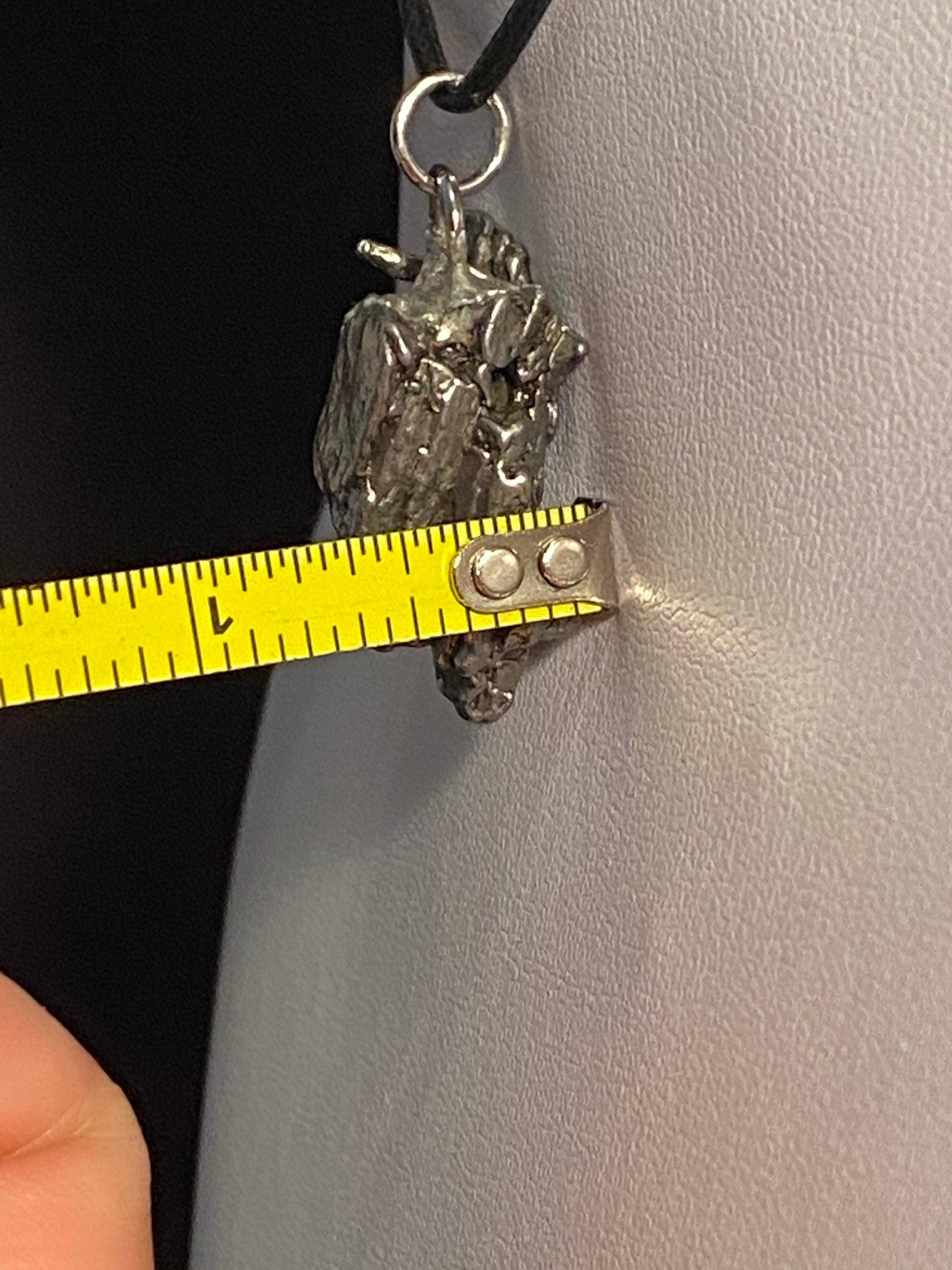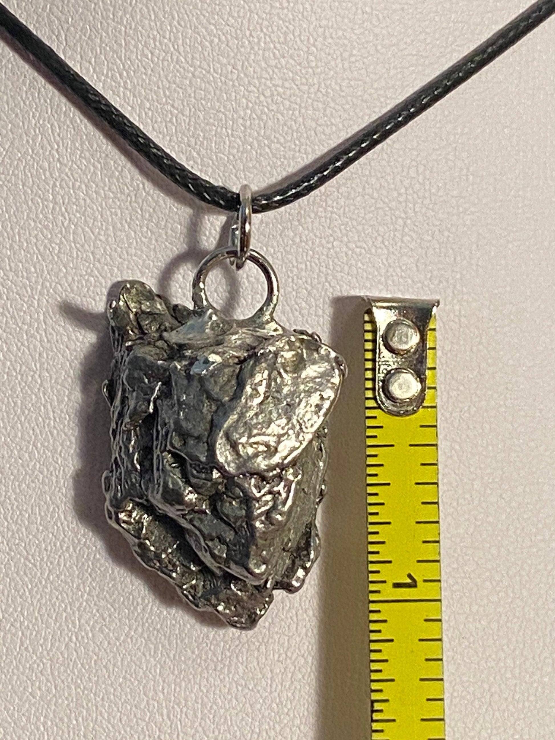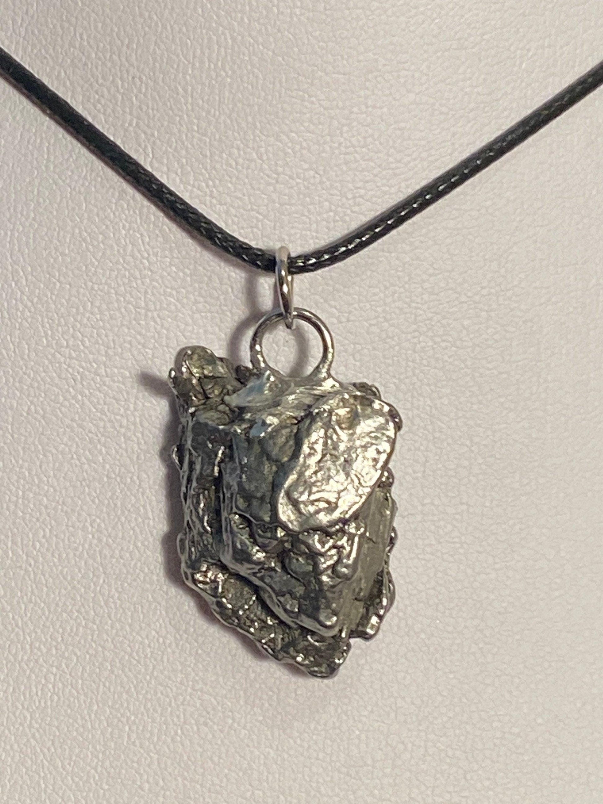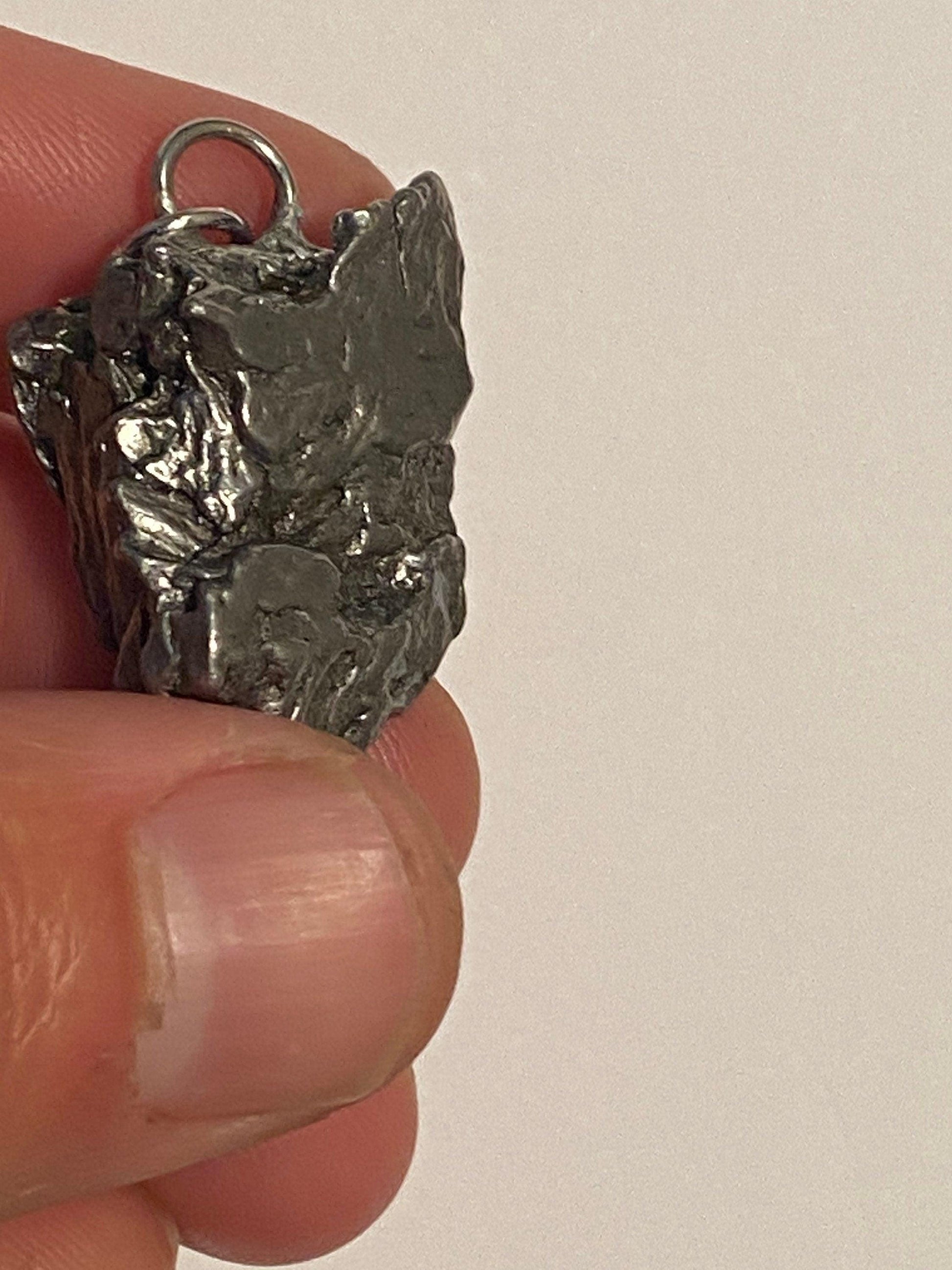 Unique Campo Del Cielo Meteorite Meteorite Pendant. This one has such a unique shape with amazing features. The weight is 21.09 grams the meteorite is just over 1” long and 3/4” wide. This pendant can be personalized with a tag for $15. It comes with a complimentary 20” sterling silver snake chain or 18” leather necklace, you choose. The perfect unique gift for yourself or loved one. This meteorite is gorgeous, fully regmaglypted, with no rust! Looks amazing in the sunlight and will be sure to get attention. Free shipping!