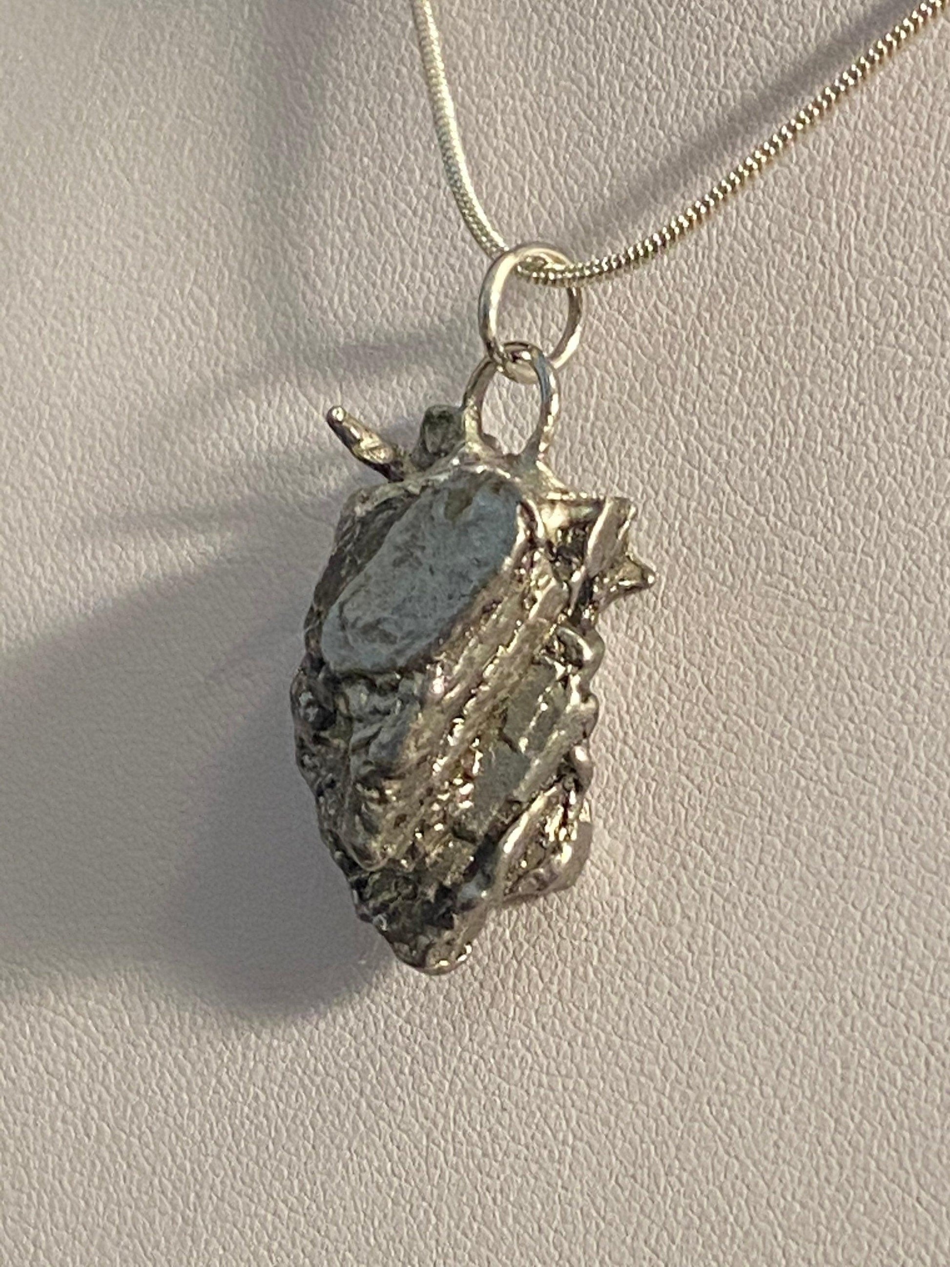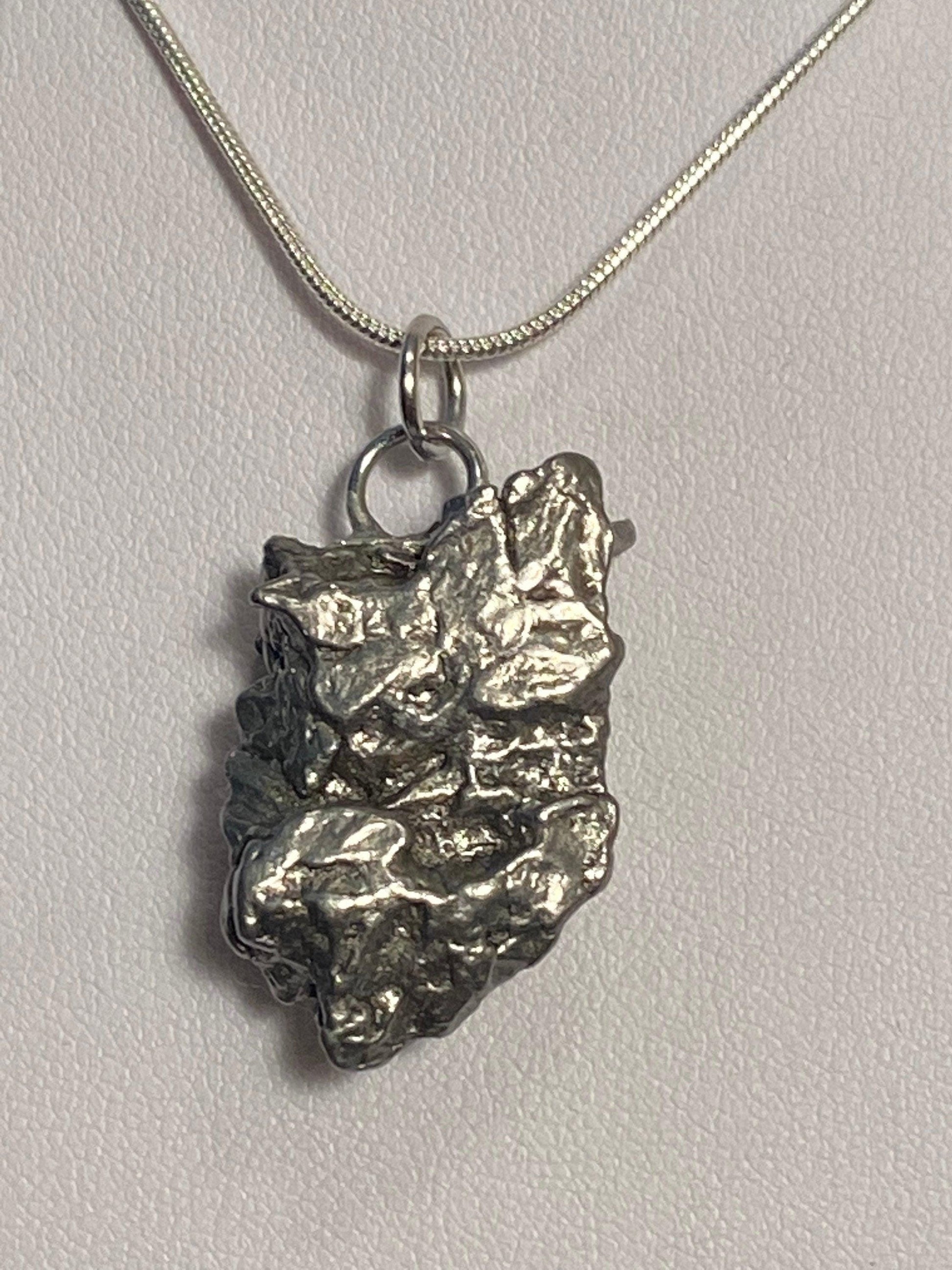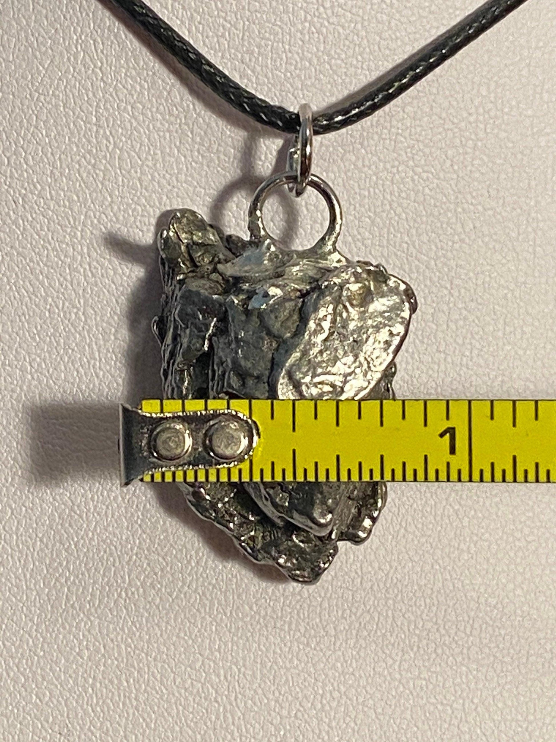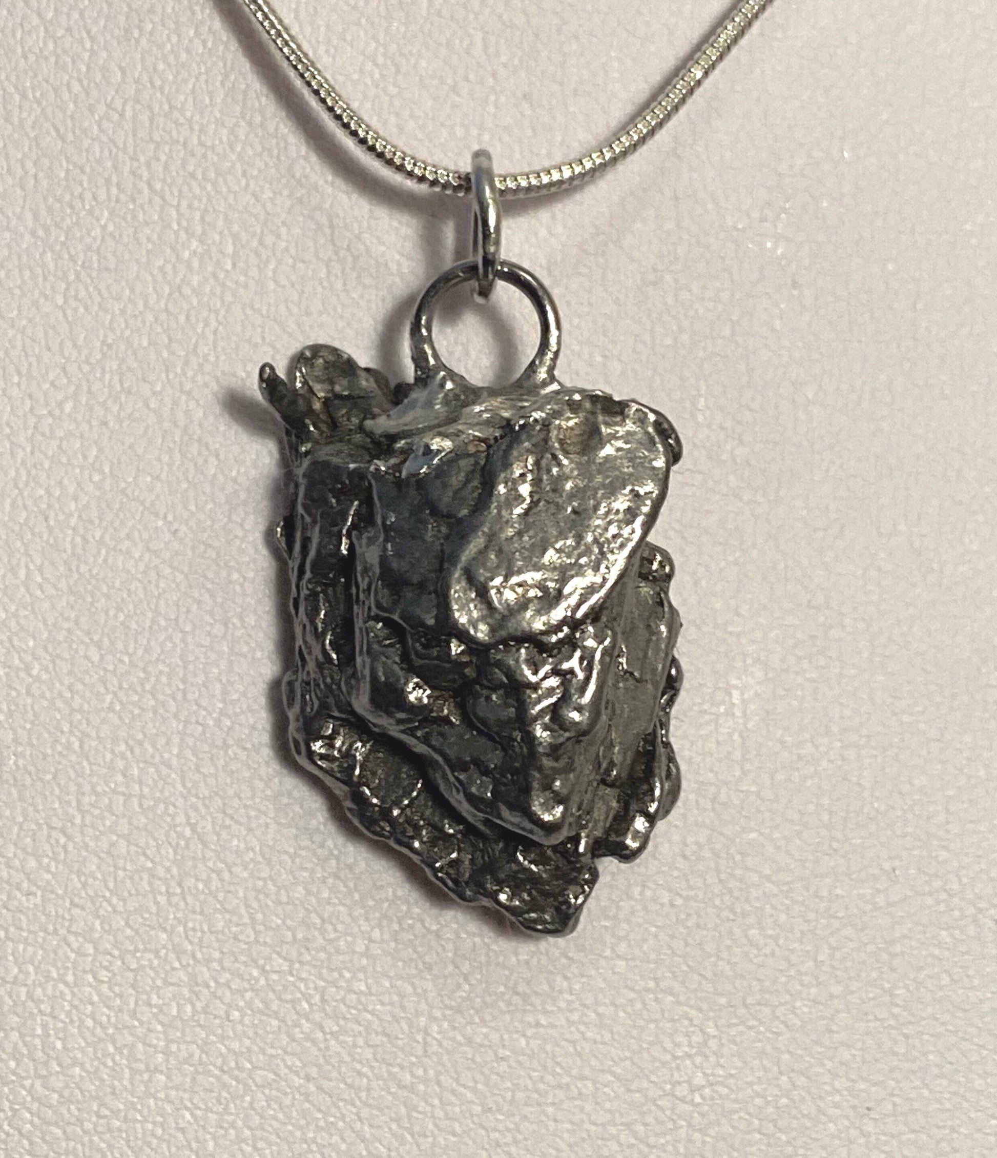 Unique Campo Del Cielo Meteorite Meteorite Pendant. This one has such a unique shape with amazing features. The weight is 21.09 grams the meteorite is just over 1” long and 3/4” wide. This pendant can be personalized with a tag for $15. It comes with a complimentary 20” sterling silver snake chain or 18” leather necklace, you choose. The perfect unique gift for yourself or loved one. This meteorite is gorgeous, fully regmaglypted, with no rust! Looks amazing in the sunlight and will be sure to get attention. Free shipping!