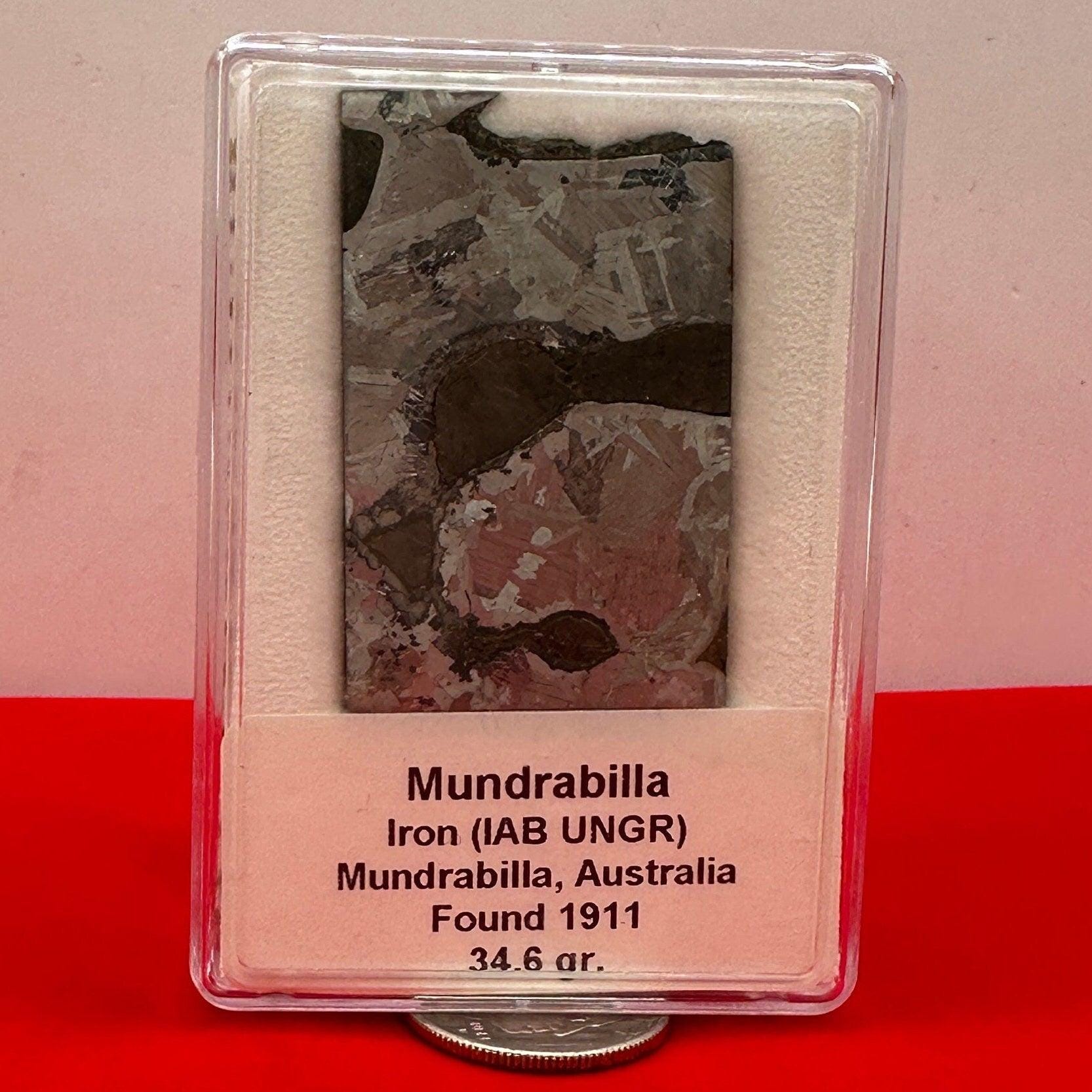 This is a beautiful rare Mundrabilla Iron Meteorite Etched and polished slice. This beautiful Meteorite is from Australia from Australia. Beautiful museum grade meteorite with a unique form. The measurements of this meteorite are just under 2.25” long, 1.5” wide and the weight is 34.56 grams. It comes was a display case, a stand and a COA.