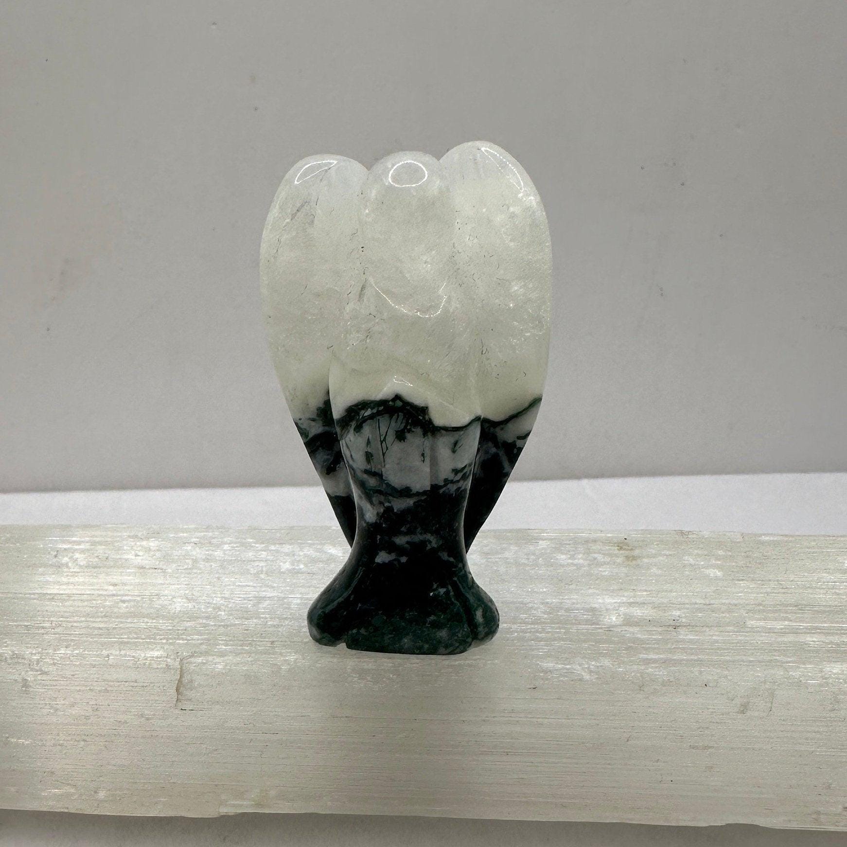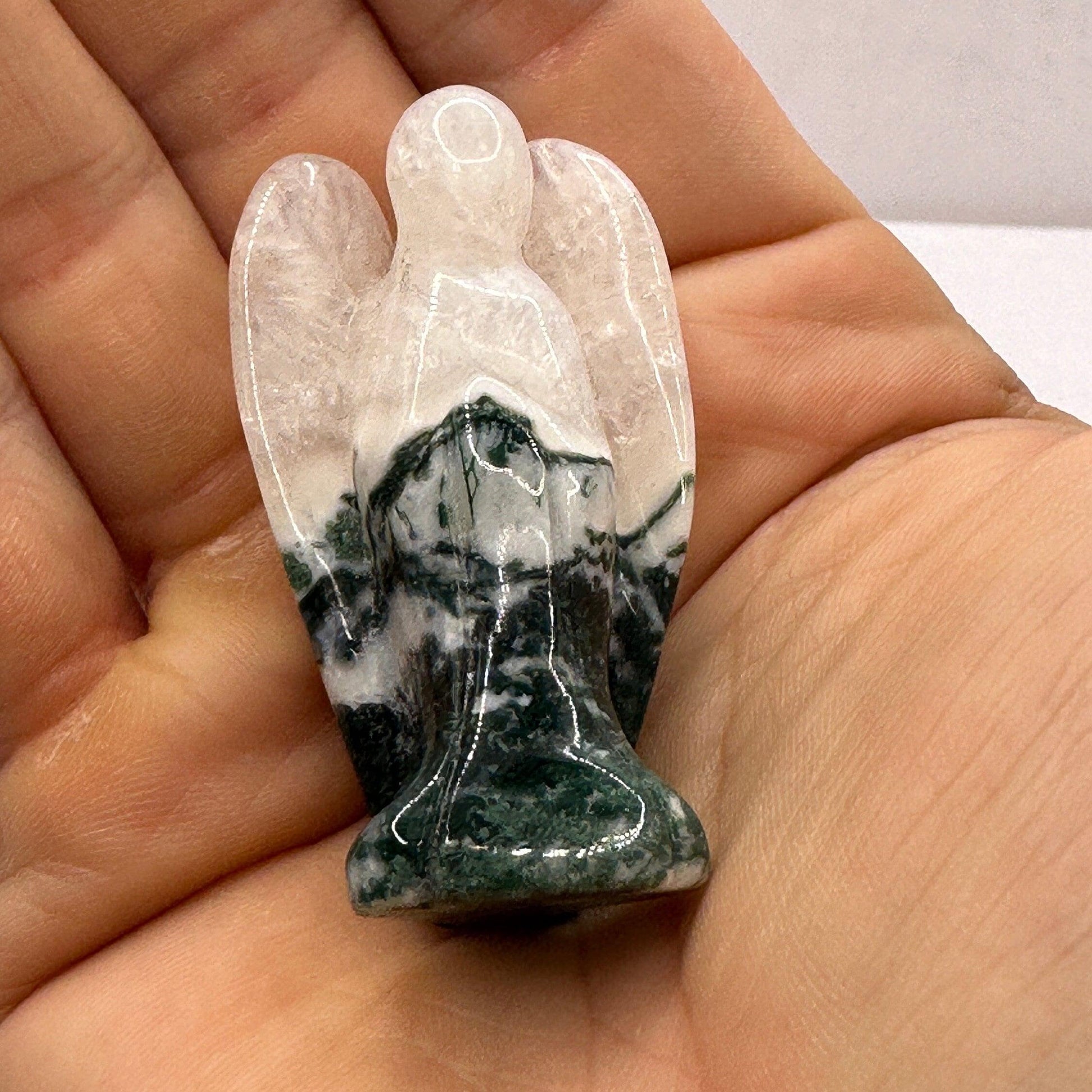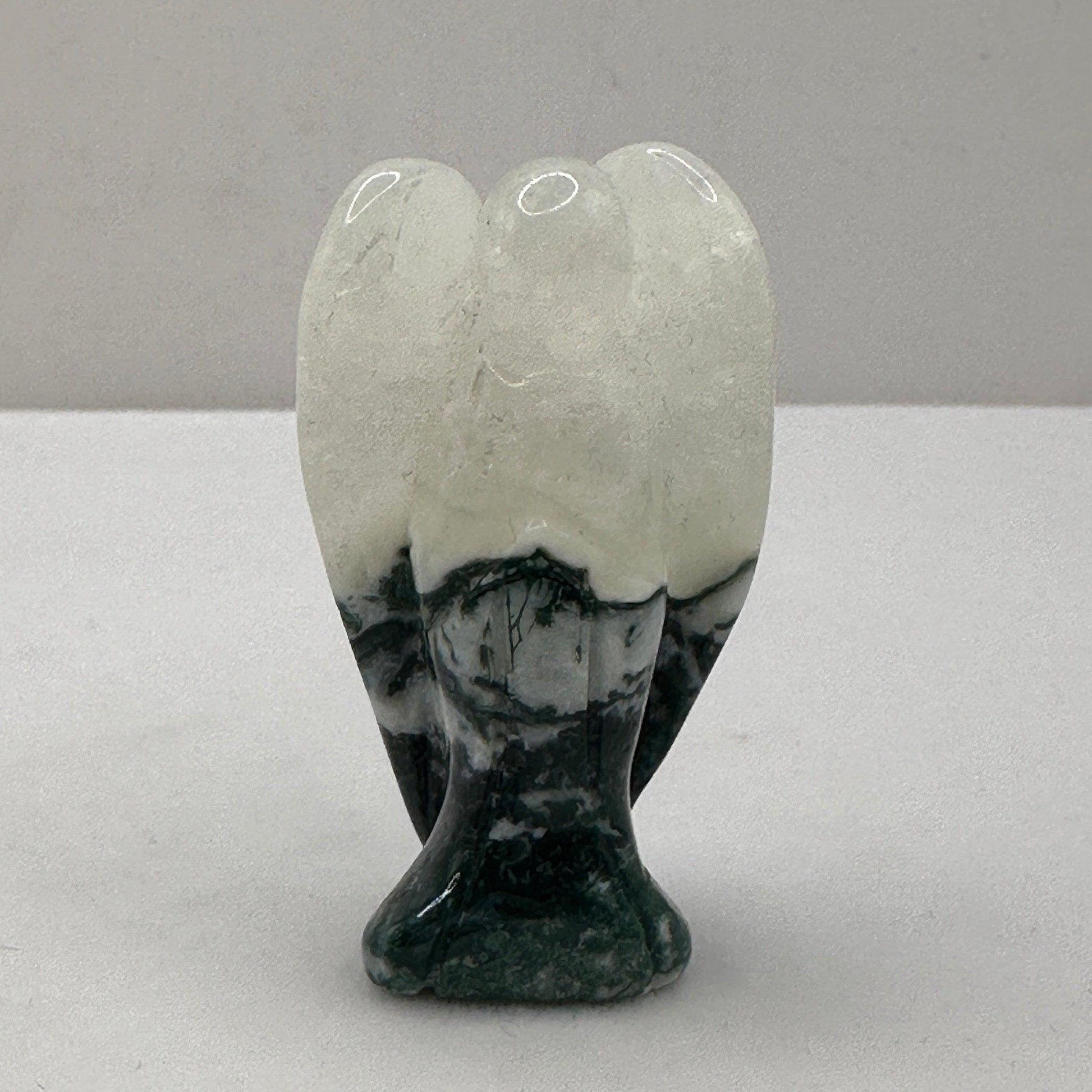 Crafted with remarkable skill, the angel's delicate features and flowing robes are brought to life, capturing the essence of tranquility and purity. Its soothing presence makes it an ideal adornment for your living space, meditation area, or as a meaningful gift to someone special. Moss agate is believed to be a stone of abundance, promoting emotional balance and grounding. It is said to enhance mental concentration, persistence, and endurance, making this angel a perfect companion for those seeking harmony and inspiration in their daily lives.