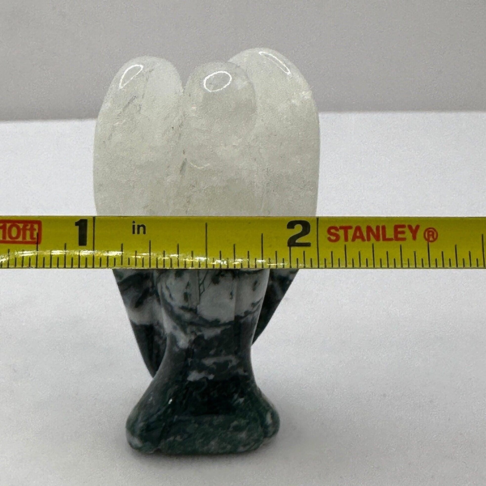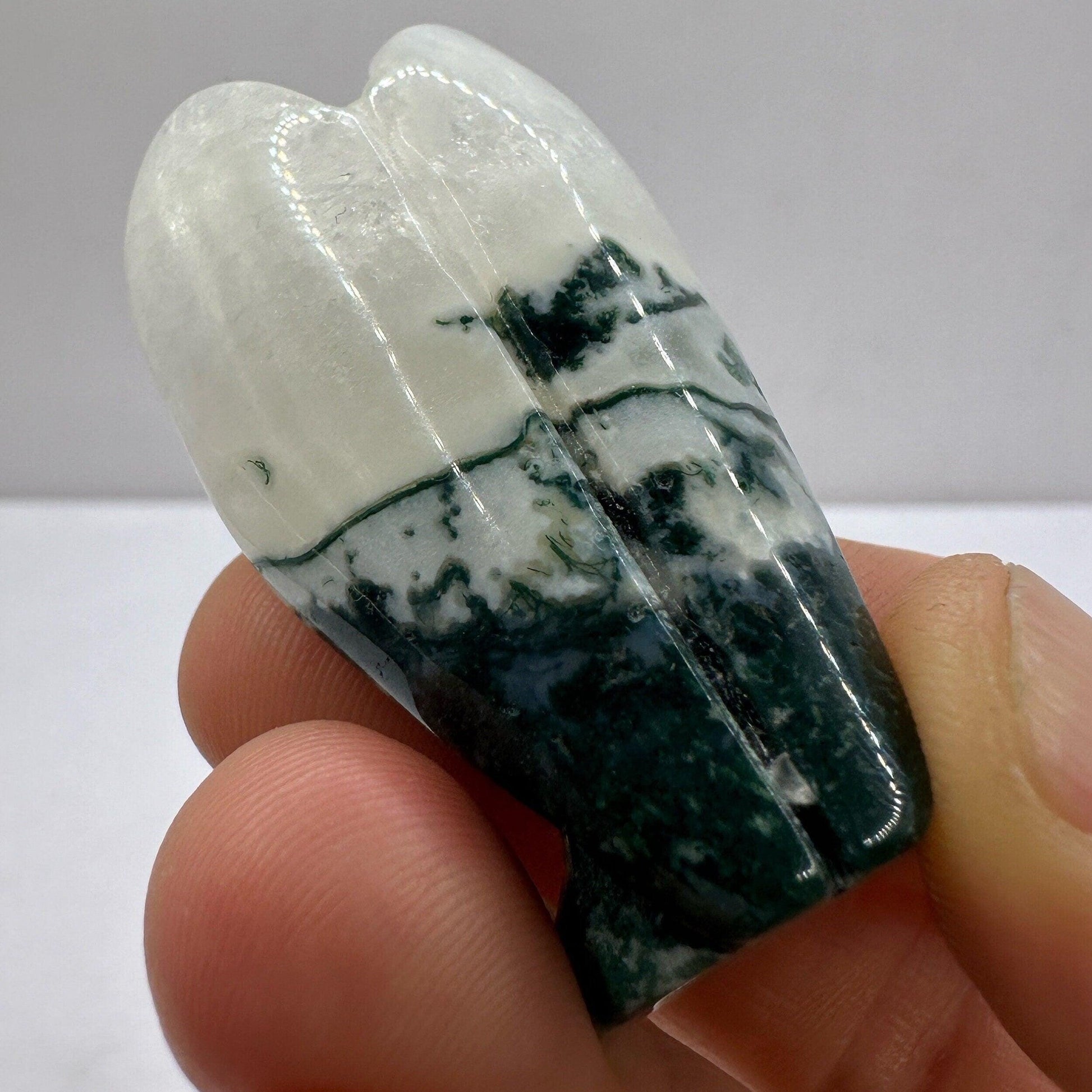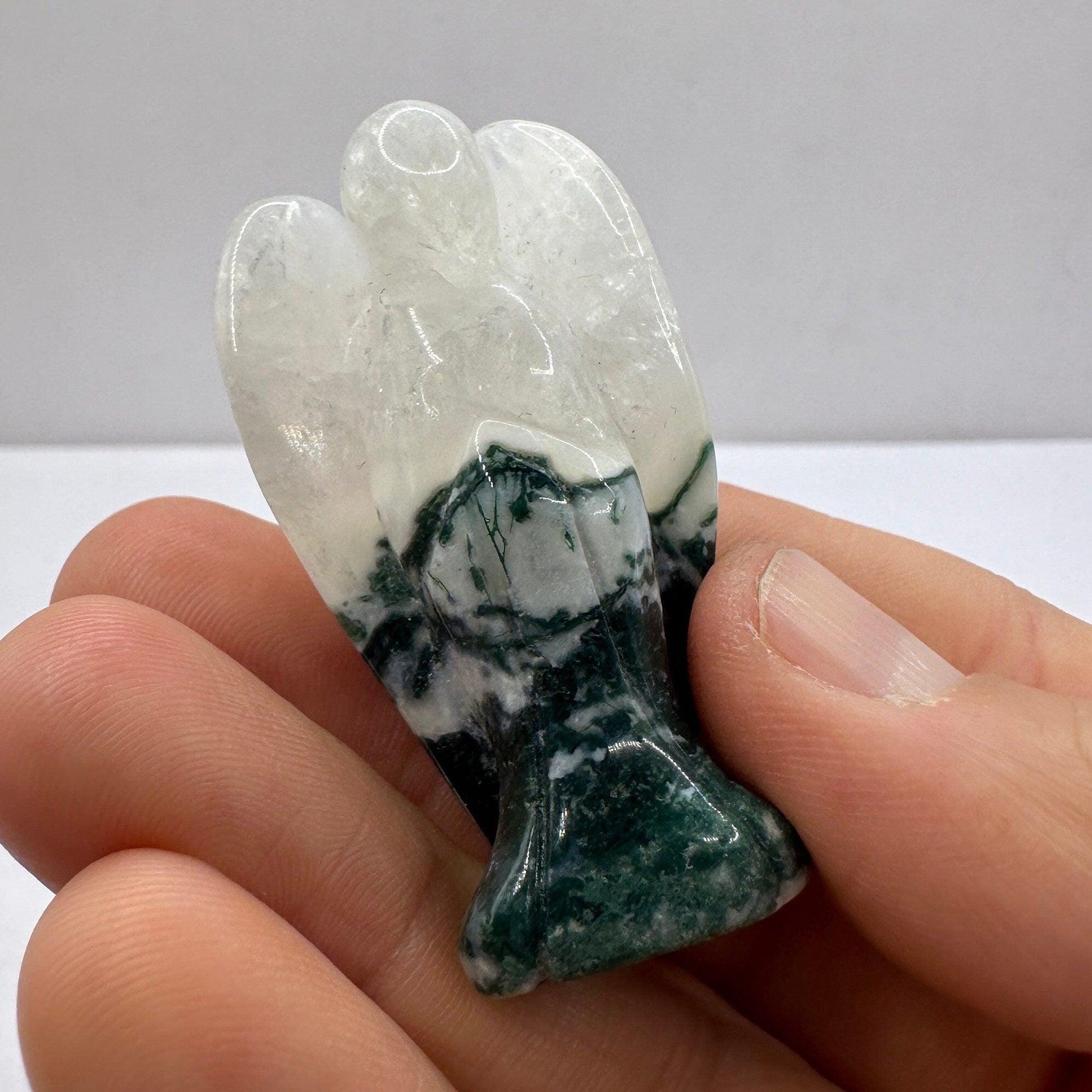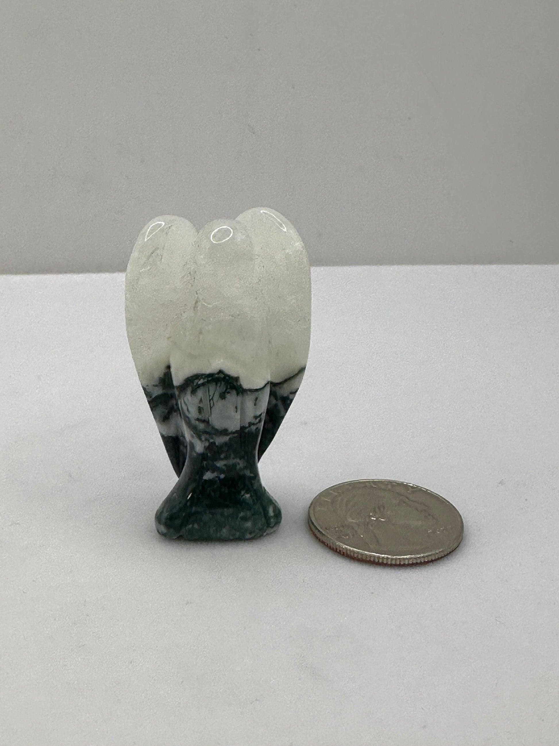 Crafted with remarkable skill, the angel's delicate features and flowing robes are brought to life, capturing the essence of tranquility and purity. Its soothing presence makes it an ideal adornment for your living space, meditation area, or as a meaningful gift to someone special. Moss agate is believed to be a stone of abundance, promoting emotional balance and grounding. It is said to enhance mental concentration, persistence, and endurance, making this angel a perfect companion for those seeking harmony and inspiration in their daily lives.