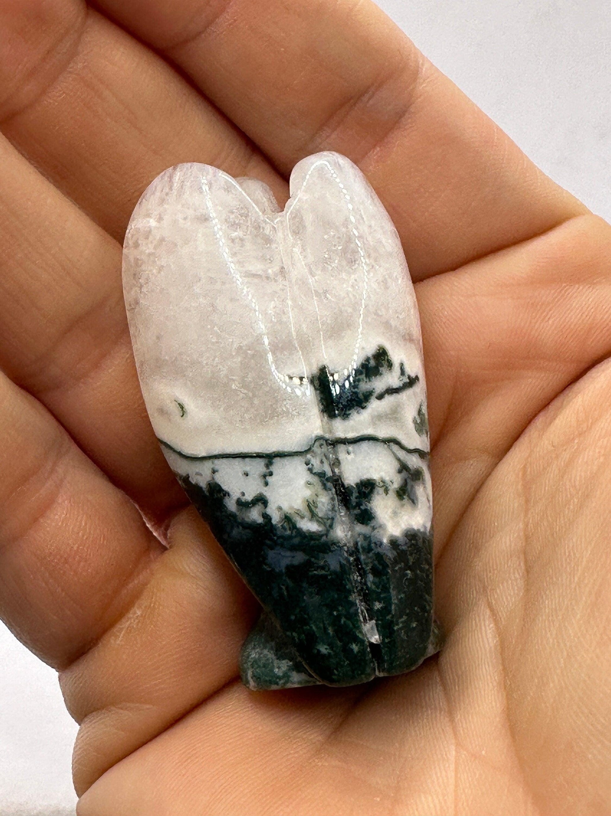 This Moss Agate Angel is not just a gemstone carving; it's a symbol of peace, serenity, and the enduring beauty of nature. Let it grace your space with its gentle energy, reminding you of the balance and tranquility that exists within and around you. A unique and precious addition to any collection, this angel is sure to captivate the hearts of all who behold its natural elegance.